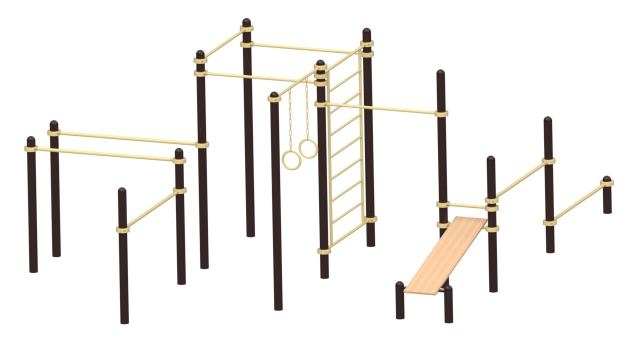 Данный спортивный комплекс помогает развивать ловкость, силу хвата, прорабатывать все группы мышц. Позволяет выполнять широкий спектр упражнений на открытом воздухе, что способствует отменной физической подготовке и здоровому образу жизни. Состоит комплекс из следующих элементов: