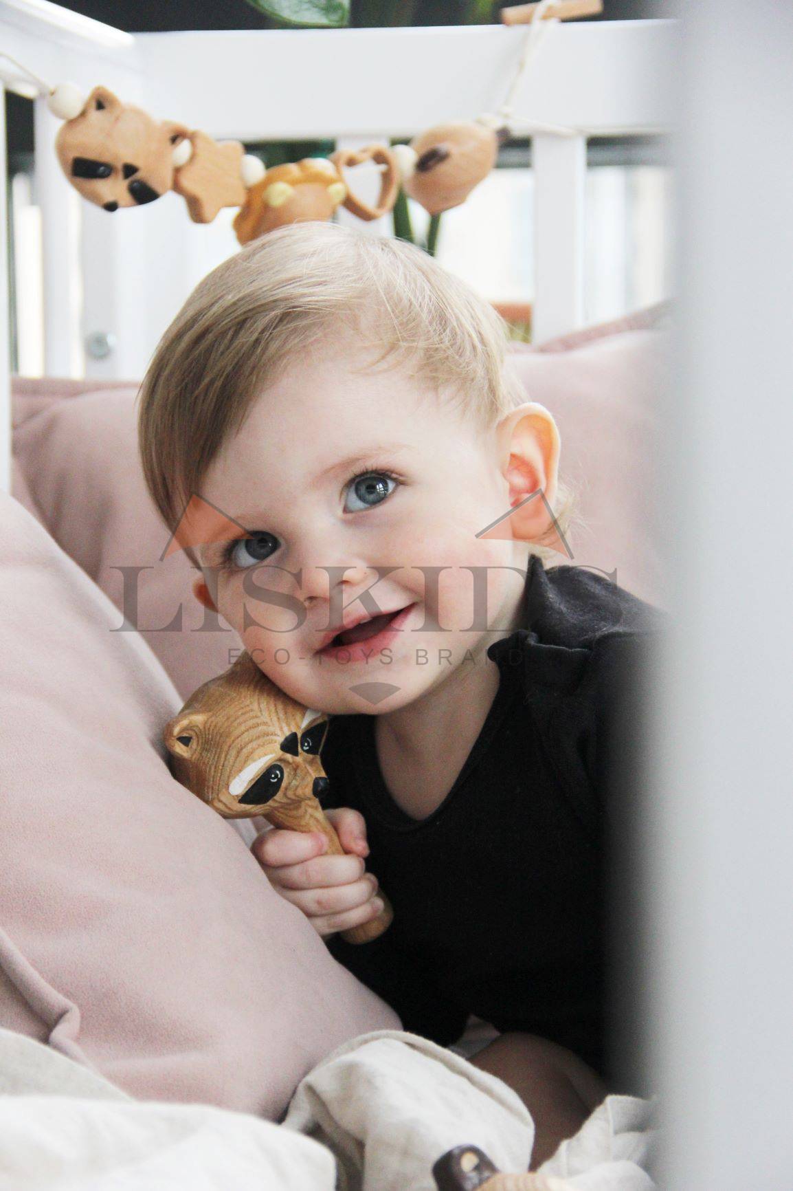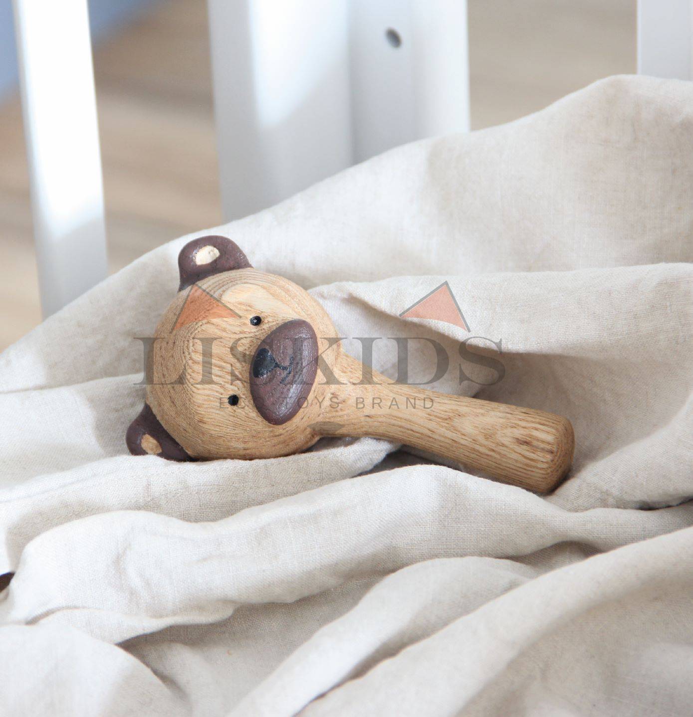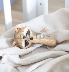 Эко-погремушка изготовлена из прочного ясеня и покрыта безопасным маслом немецкого бренда Osmo. Цветные элементы забавной мордочки енота выполнены акриловыми красками.