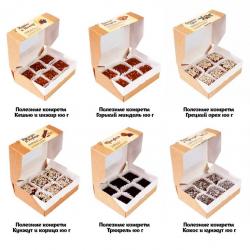 1.Кокос-кунжут 2.Кунжут-корица 3.Инжир-кешью 4.Грецкий орех 5.Горький миндаль 6.Трюфель Полезные конфеты «Русские традиции», благодаря своему натуральному составу не только вкусные, но и очень полезные. Основной ингредиент — это финики, а в них очень много витаминов, солей и минералов, необходимых для нормального функционирования организма человека. 23 вида различных аминокислот, которые отсутствуют в большинстве других фруктов. Не содержат: сахар, красители, ароматизаторы, консерванты! Условия хранения: при температуре от 0 до +25°С и относительно влажности воздуха не более 75% Срок годности: 3 месяца. Вес: 100 г