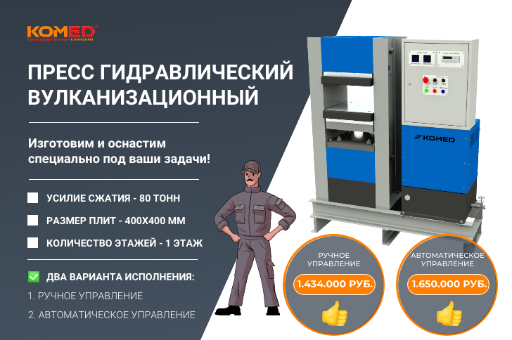 Пресс гидравлический вулканизационный 400х400 - 1 этаж 80 тонн производства ООО "КОМЕД". Данный пресс изготавливается в двух вариантах: с ручным и автоматическим управлением.