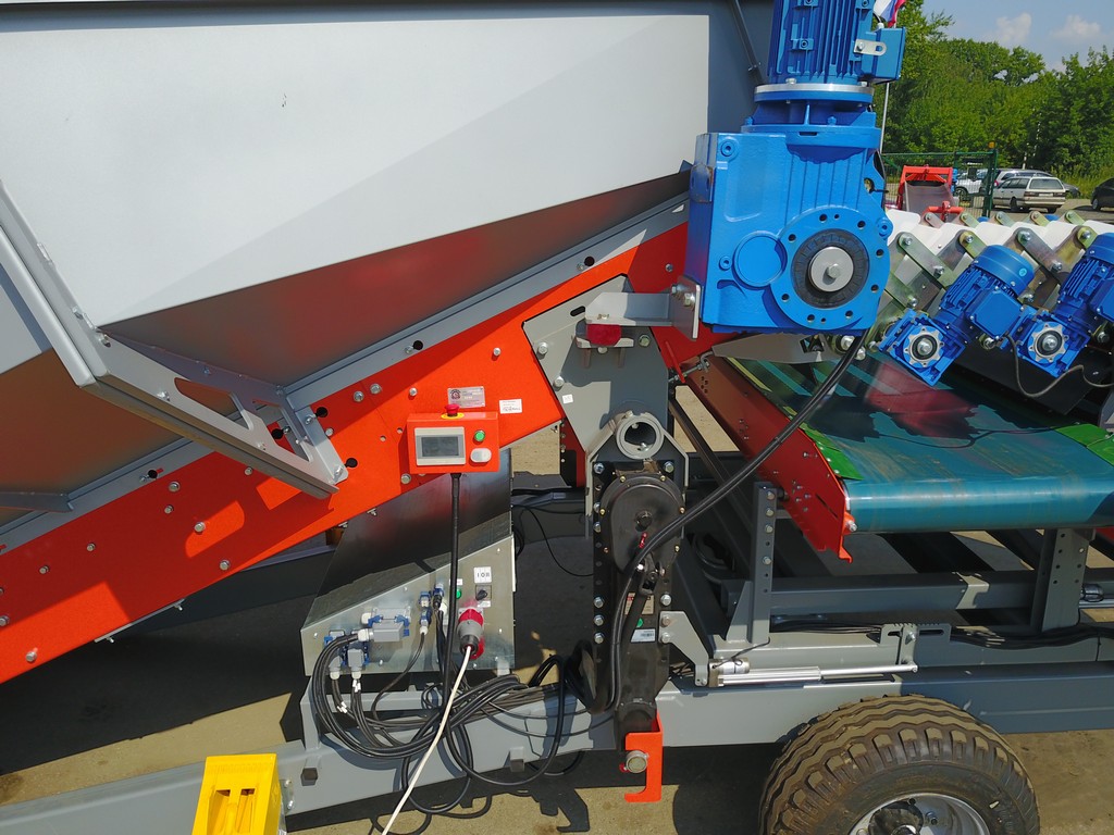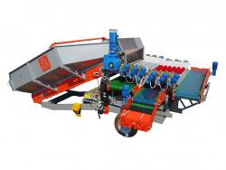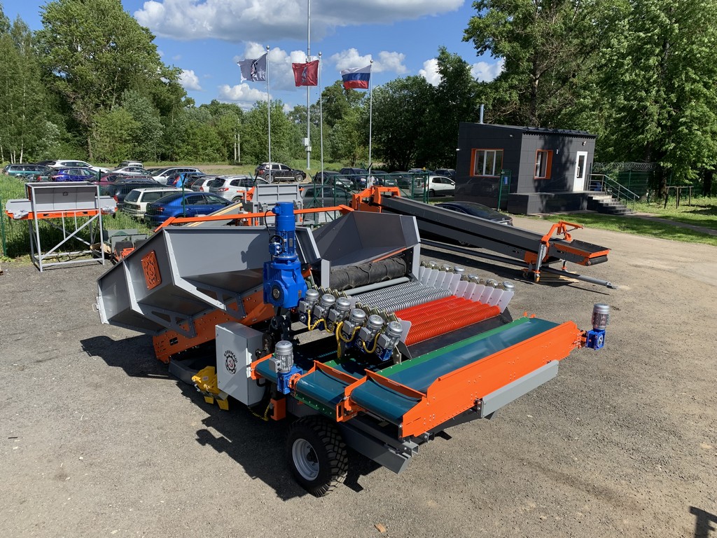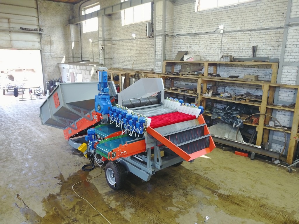 1. Прием продукции с поля из самосвальных транспортных средств, отделение земли и вороха, сортировка продукта на три фракции по размеру. При оснащении приемного бункера дополнительным прутковым обрезиненным транспортером с механизмом встряхивания появляется возможность отделения бэби картофеля для продажи в торговые сети или использования в качестве семенного материала.
