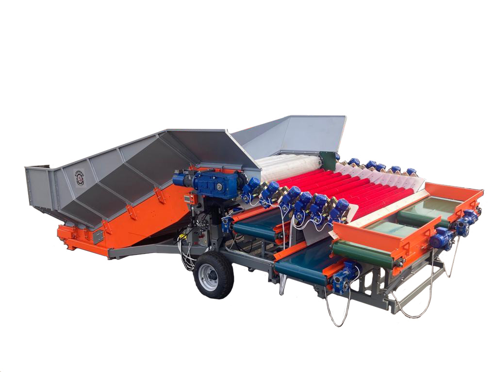 Чтобы избежать затора при таком большом перепаде ширины, вместо последнего единого отводящего транспортера применяют систему сдвоенных конвейеров, которые улавливают продукт по всей ширине вальцовой группы и направляют его в середину, где он попадает на 800 мм транспортер, расположенный торцом к приемному бункеру.