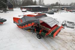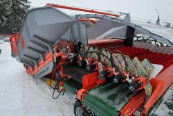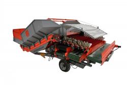 Этот гидравлический приемный бункер не является полным прототипом какого-то одного знаменитого европейского бренда. Он полностью с нуля сконструирован инженерами КЛИНМАШ на основе наиболее удачных конструктивных решений трех самых известных европейских производителей Grimme, Miedema и Bijlsma Hercules. Основные параметры взяты с Гримме, поэтому он такой же высокий, имеет такую же минимальную высоту отводящих транспортеров, под которые удобно ставить контейнеры, объемный кузов, но с резино-металлической защитой и еще более мощную, чем у Grimme рамную конструкцию. Зато часть необоснованно сложных и поэтому более дорогих решений от Grimme были заменены наиболее оптимальными конструкциями от Miedema и Bijlsma Hercules. В результате он стал более ремонтопригодным, его себестоимость снизилась, а надежность и удобство повысились.