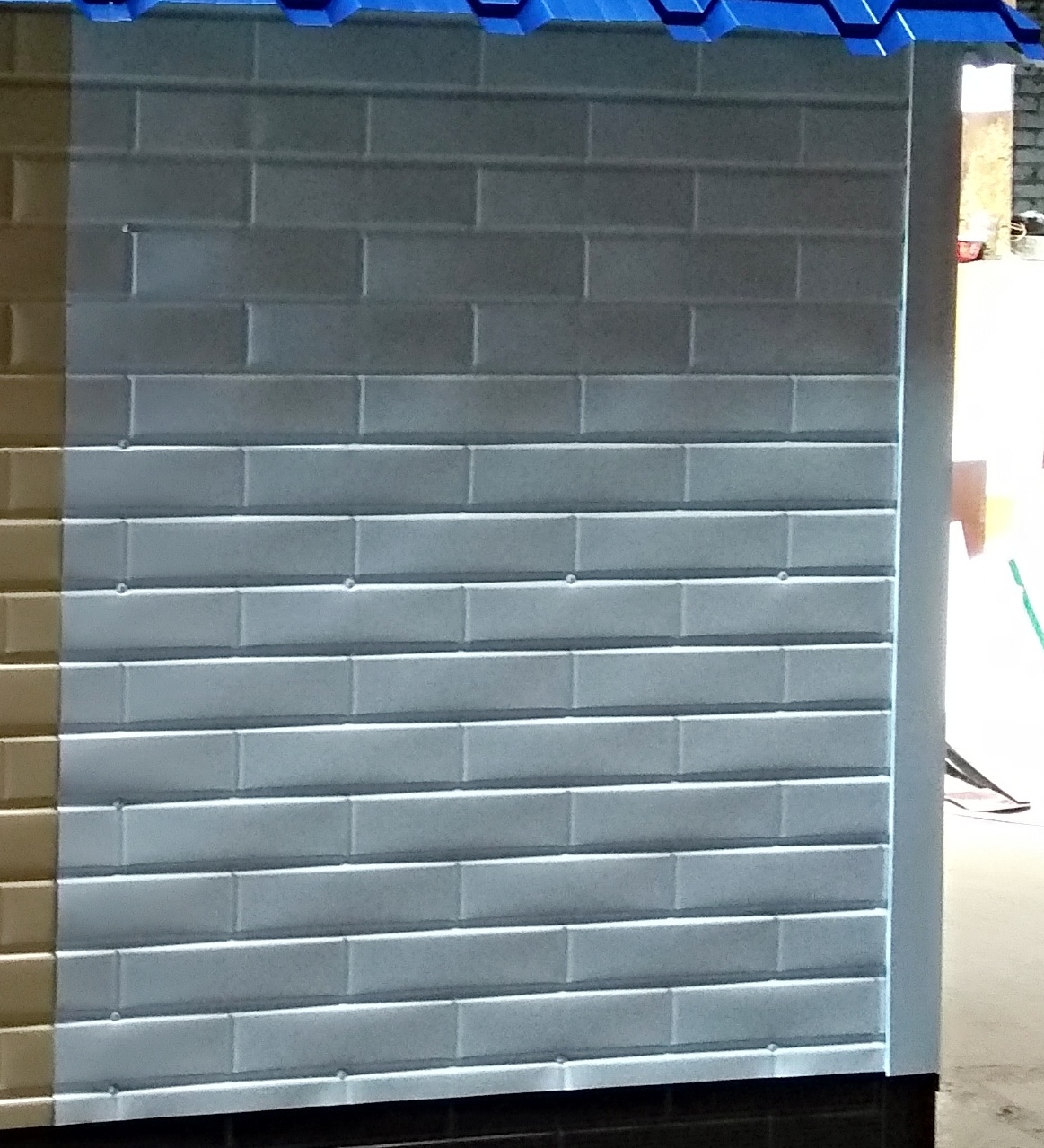 Профилированный лист из оцинкованной стали с полимерным покрытием в виде горизонтальной (по длине листа) кирпичной кладки с вогнутой расшивкой.