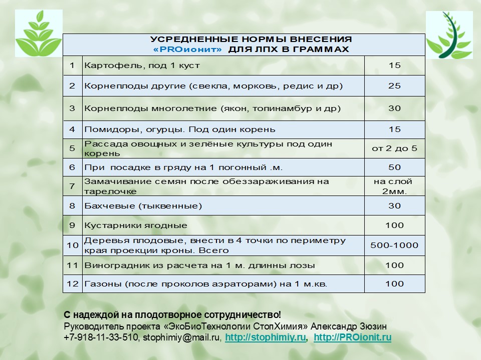 PROионит (ионообменный сорбент + бесхлорное, калийное-фосфорное удобрение) найдут применение в качестве искусственного грунта с микроэлементами, в производстве сельскохозяйственной продукции как в открытом, так и в защищенном грунте (теплицах).