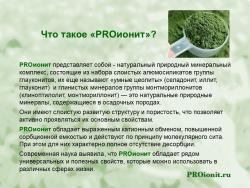 PROионит — это аутигенный минерал морских отложений, моно призматический минерал из группы алюмосиликатов, обладающий высокими абсорбционными и катионо-обменными свойствами.