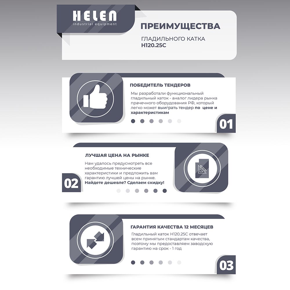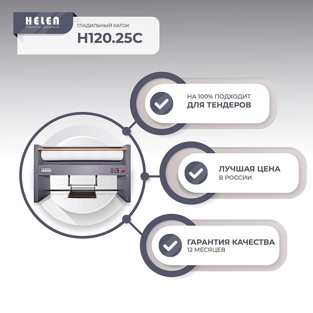 Компания «Helen» предлагает новую линейку недорогих и функциональных гладильных катков, которые полностью соответствуют тендерным характеристиками и на 35% дешевле ближайшего аналога. Мы рады представить вам новый гладильный каток Helen H120.25C, созданный для того, чтобы вы могли участвовать и побеждать в любых тендерах.