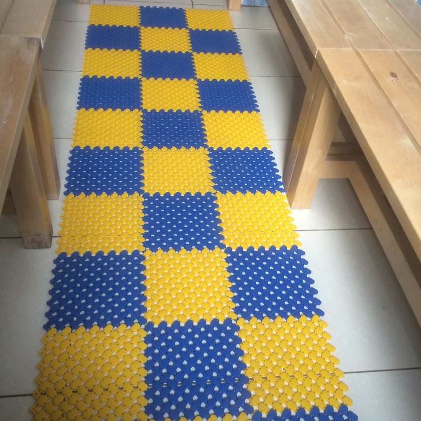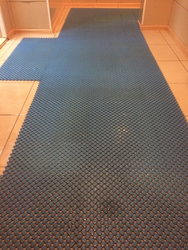 Противоскользящее модульные покрытия не заменимы в местах, где существует опасность скользкого кафельного пола. Специально разработанная изнанка модулей делает их сцепление с полом надежным, уникальная система дренажа моментально отводит воду , система вентилирования не позволяет влаги оставаться под покрытием.