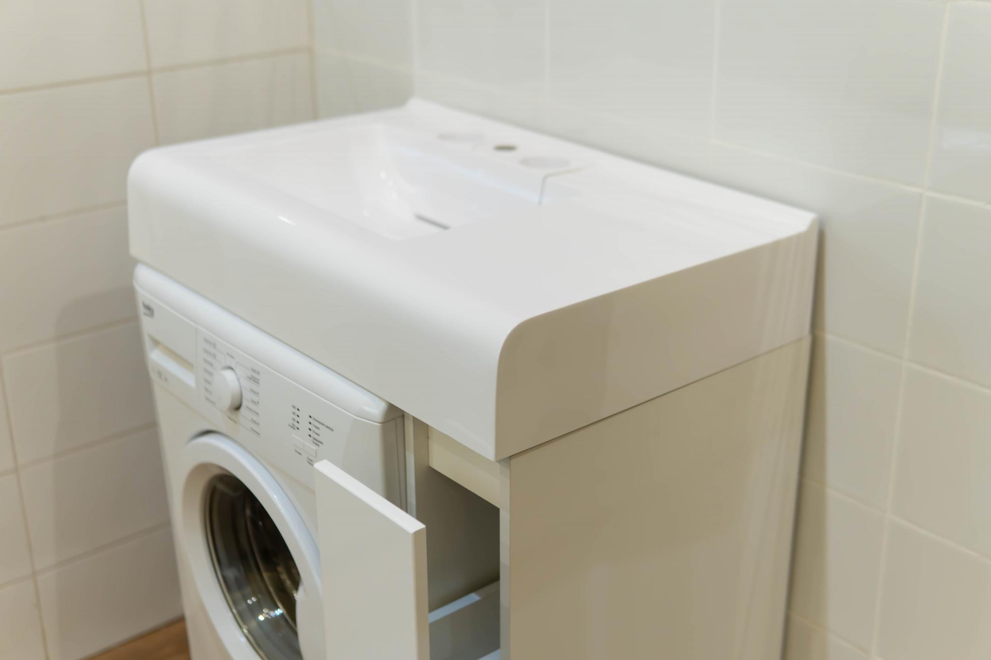 Данная модель весьма практична за счёт размещения над стиральной машиной. Стандартная система слива находится в скрытом отсеке под декоративной накладкой, которая легко снимается. Возможен заказ со встроенными стаканами, вместо декоративной накладки.