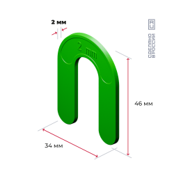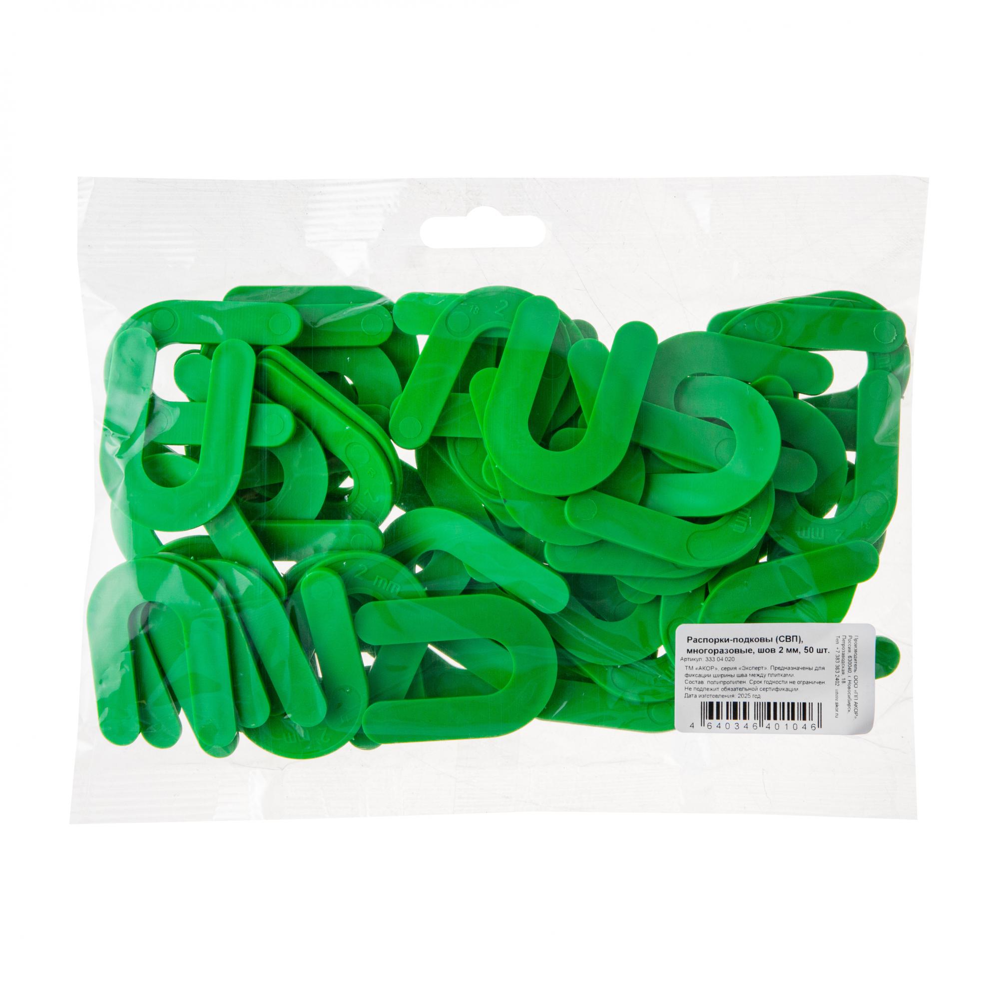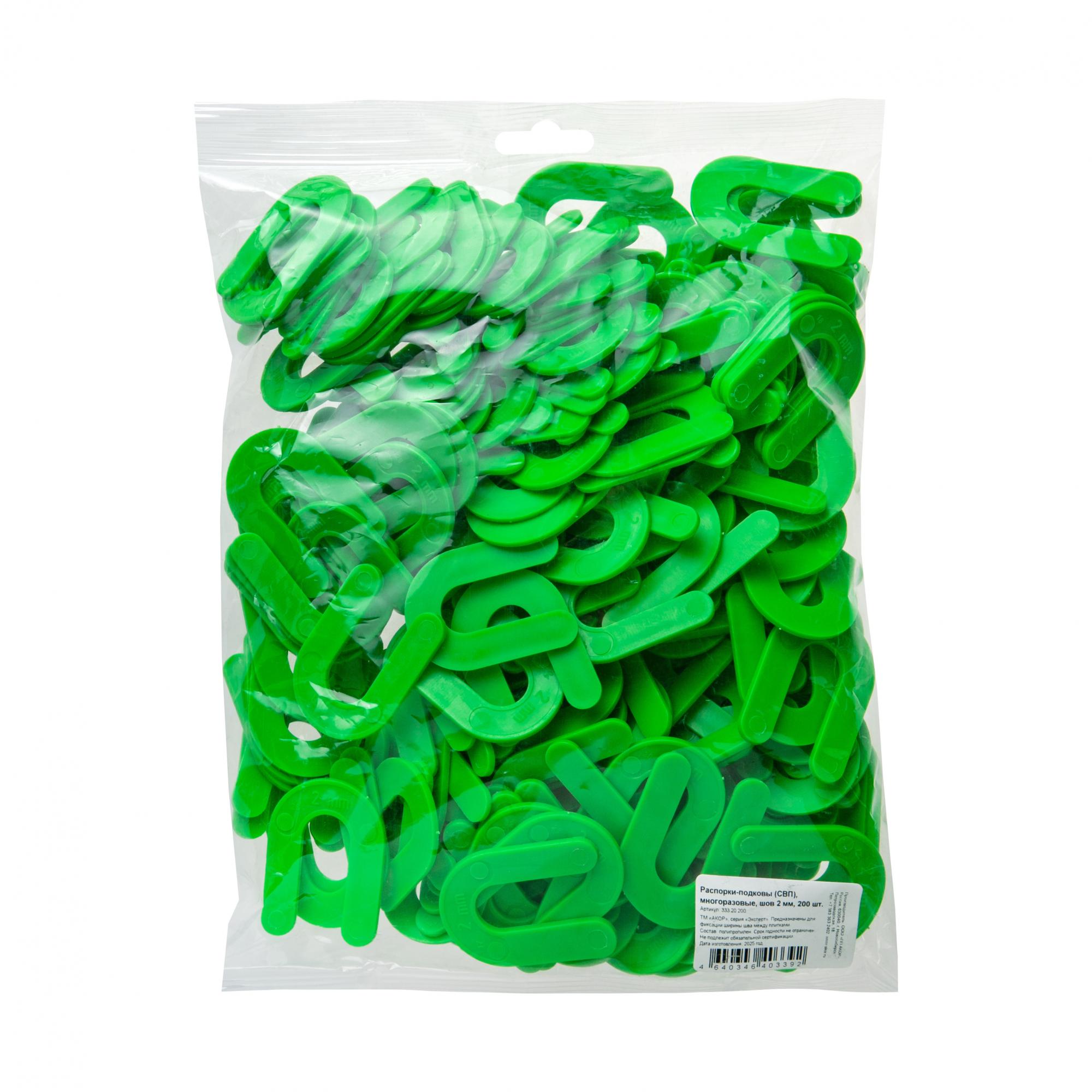 Зеленые многоразовые распорки в форме подковы. Используются для швов шириной в 2 мм. Распорки-подковы крупные, что позволяет легко извлечь их после того, как схватится клей. Подходят для плитки, керамогранита и мрамора. Могут использоваться для всех видов швов. Упакованы в пакетики по 50, 100 и 200 штук.