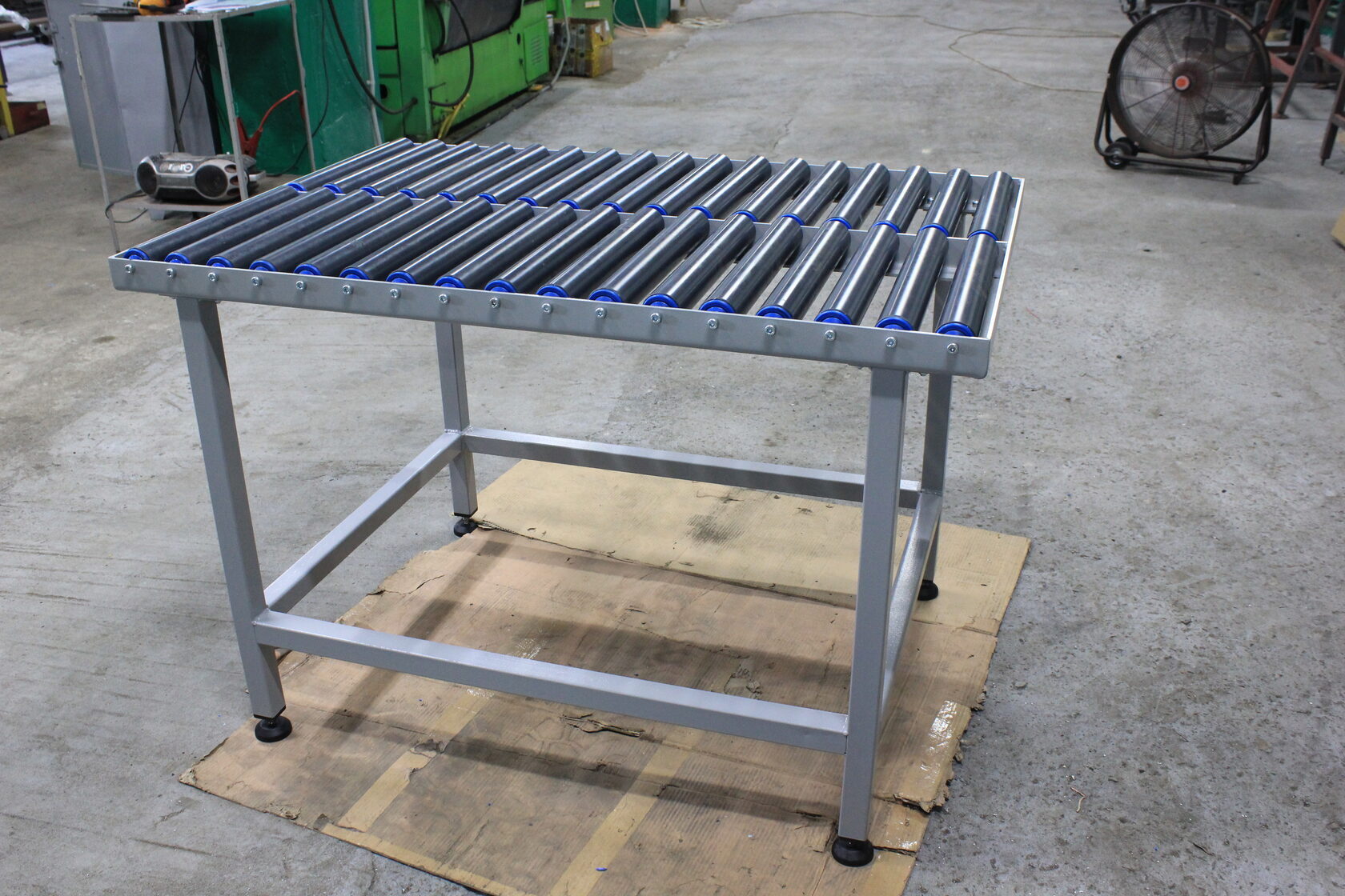 Ряд параллельных роликов с синими торцевыми элементами — основной рабочий механизм. Ролики свободно вращаются, облегчая перемещение грузов.