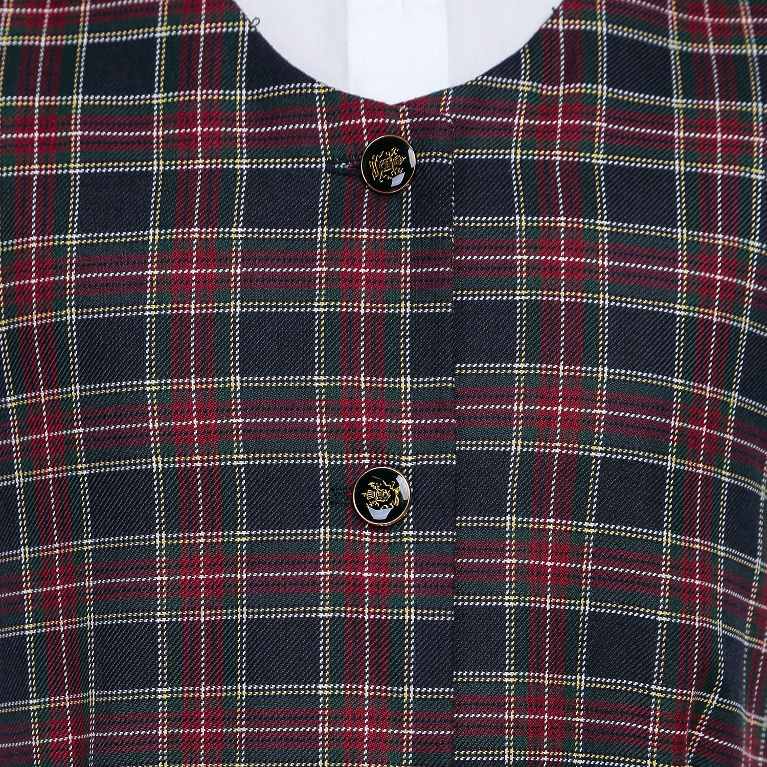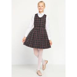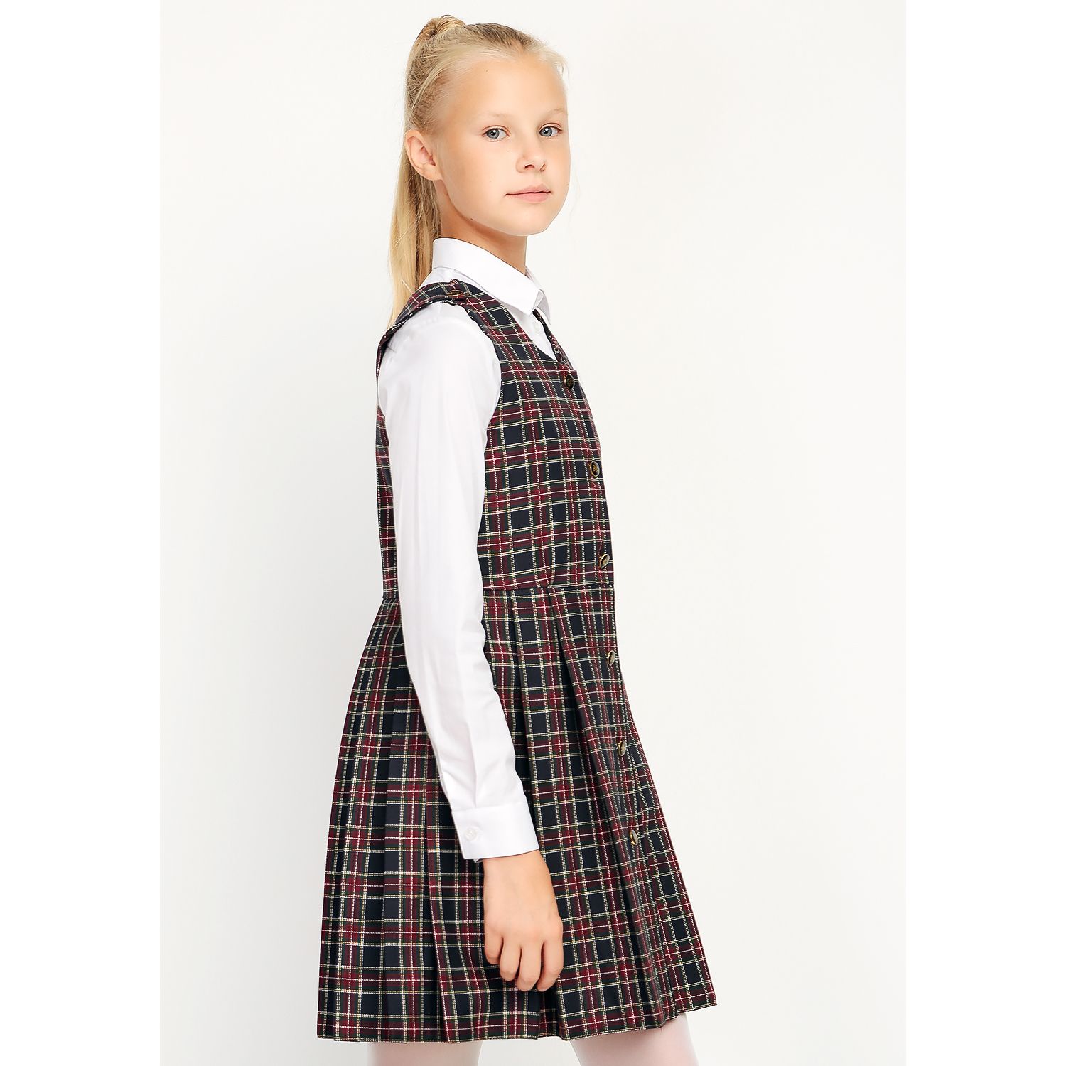 Сарафан на девочку, в сине-фиолетовую клеточку (цвета «черника»), распашной (халатиком) в складку. Без крылышек. Спереди — застежка на пуговицы.