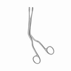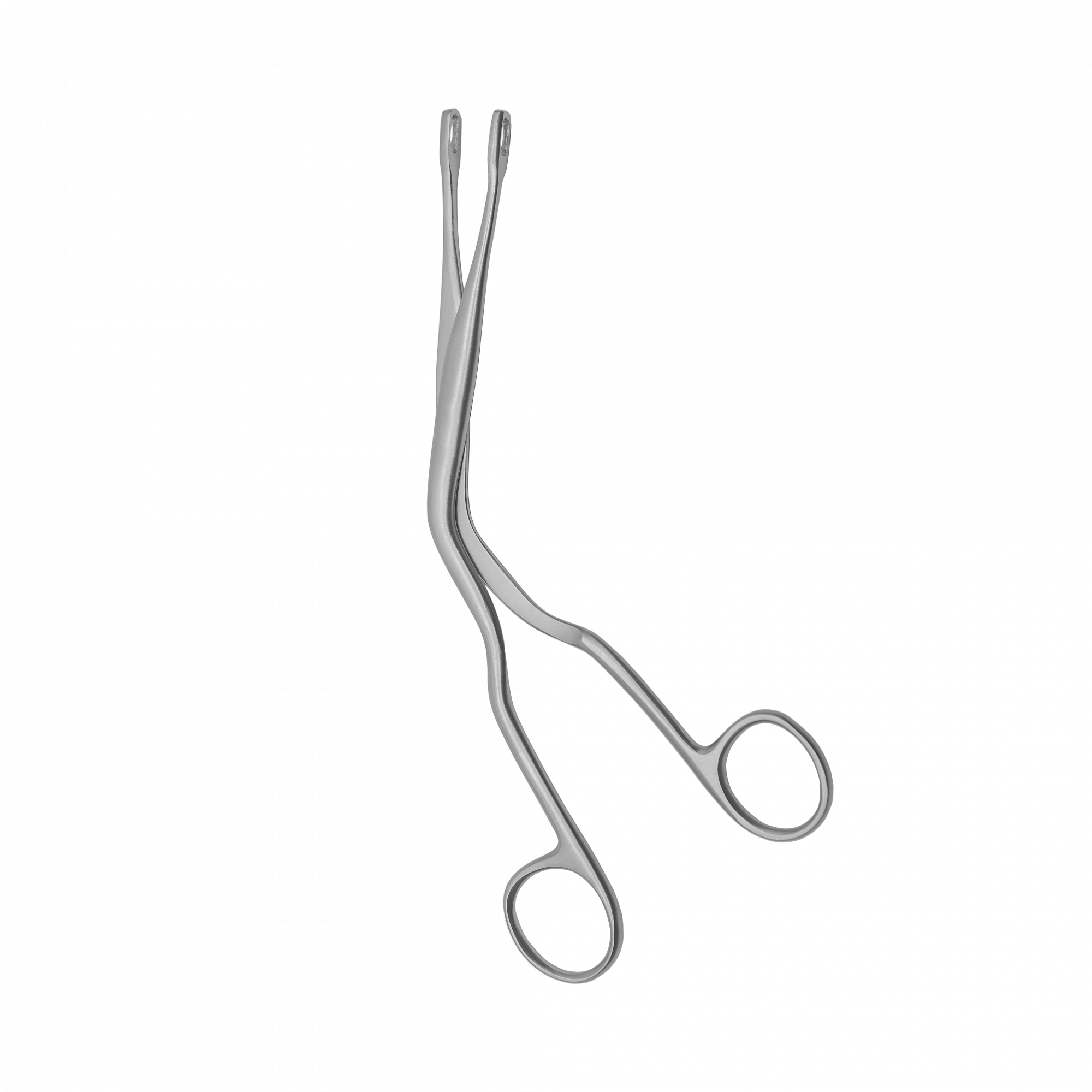 Хирургический инструмент с изогнутыми ручками. Рабочие части, которого представлены окончатыми губками.