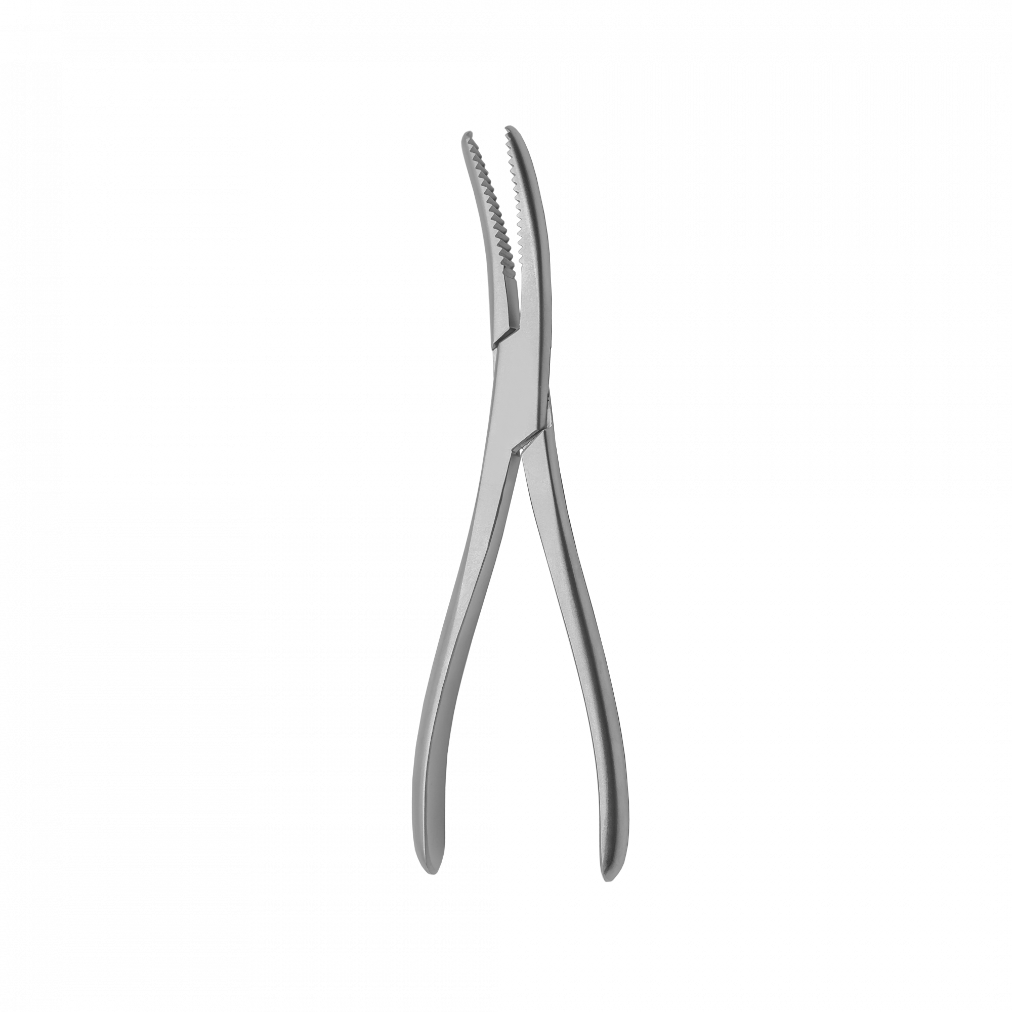 Хирургический инструмент, рабочая часть которого - изогнутые по ребру массивные губки, имеющие косую нарезку. Рукоятки массивные без колец.