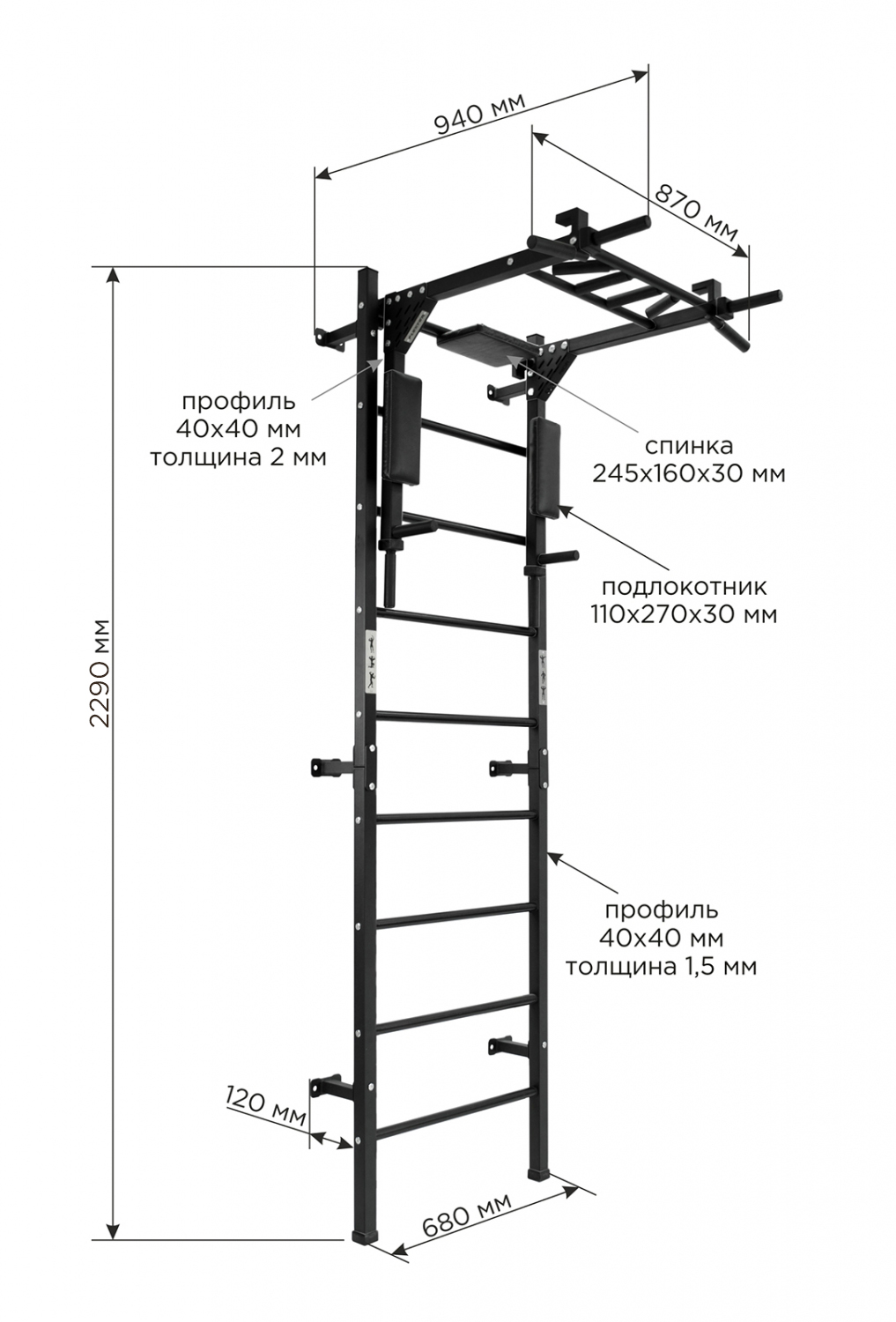 Мощный каркас из толстостенного стального профиля сечением 40х40 мм легко выдержит нагрузку до 250 кг. Стенка прочно крепится 6-ю кронштейнами.