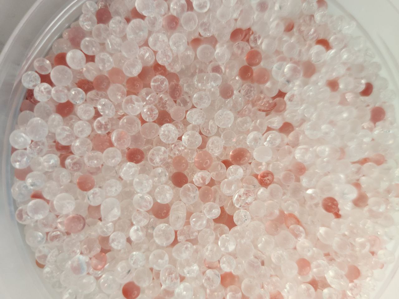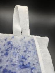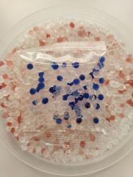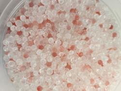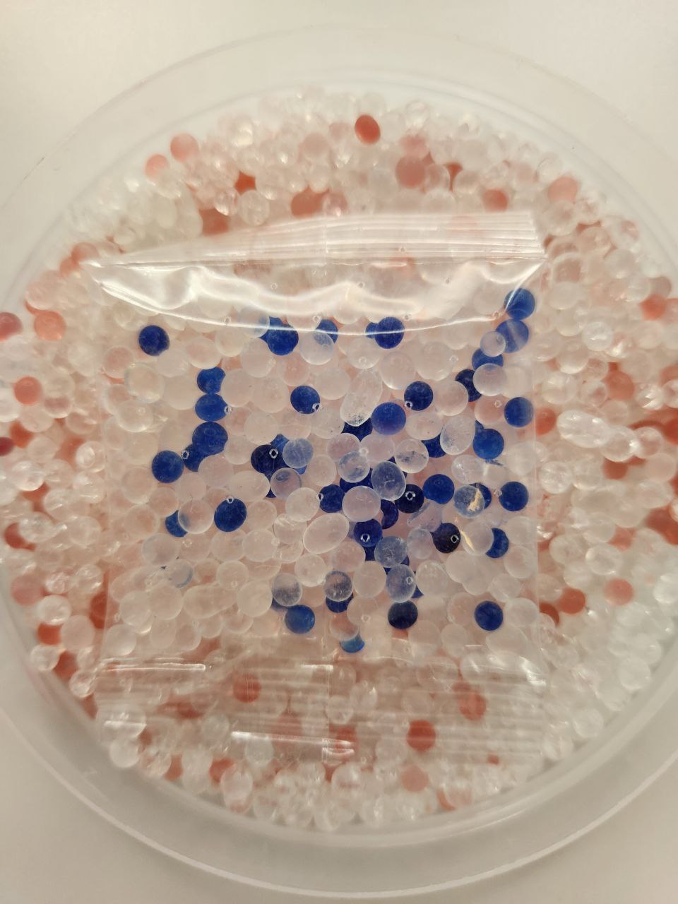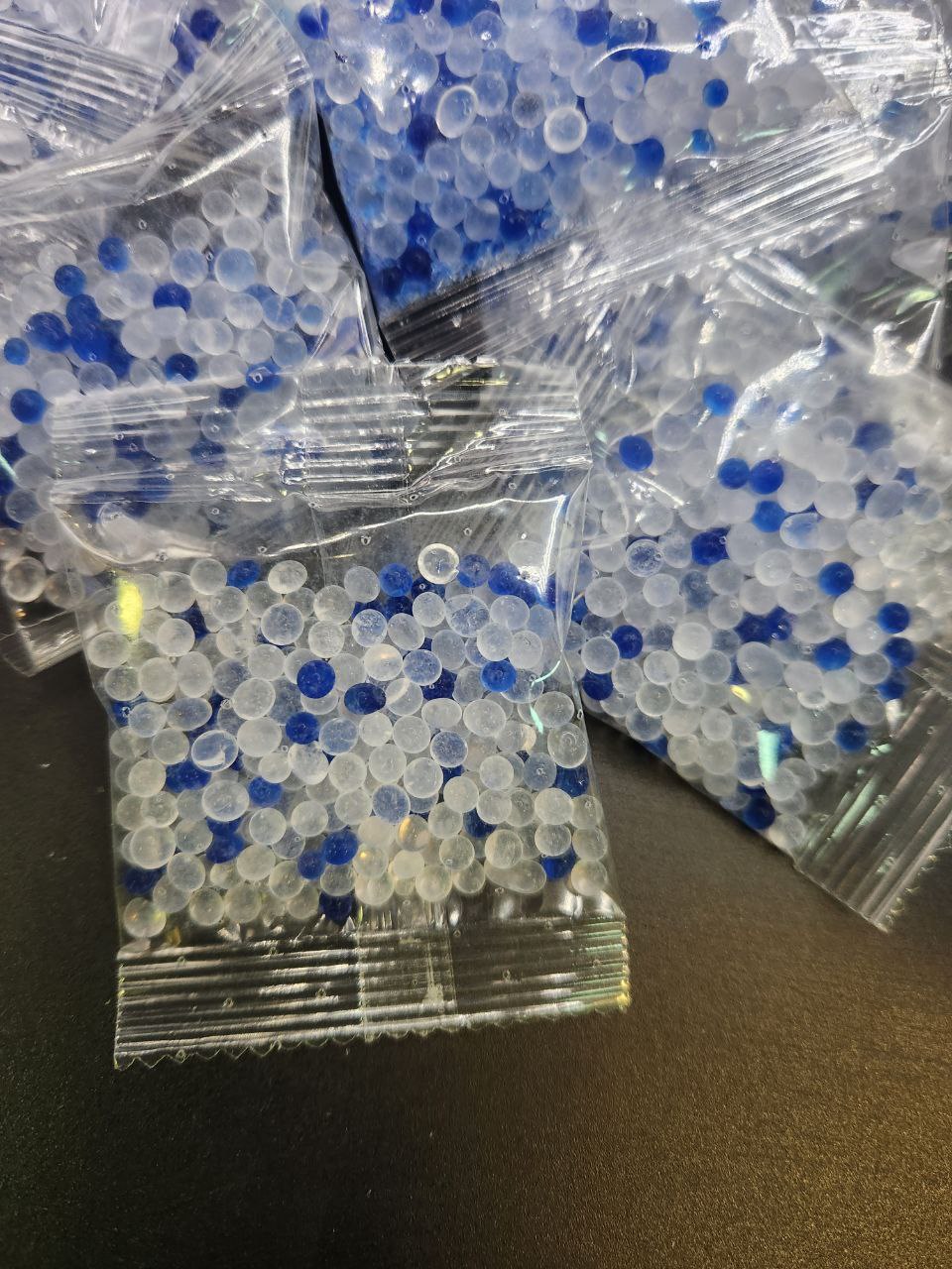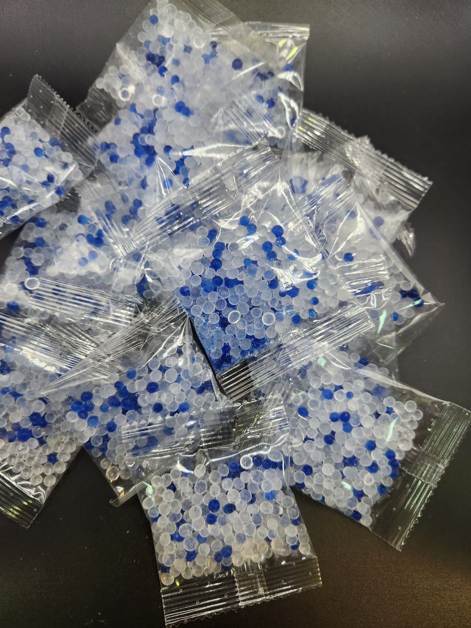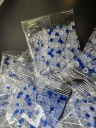 Силикагель фасованный с мешочки из нетканого полотна с окном для визуального контроля. По мере впитывания влаги и снижения активности, гранулы изменяют окраску с голубой на розовую.