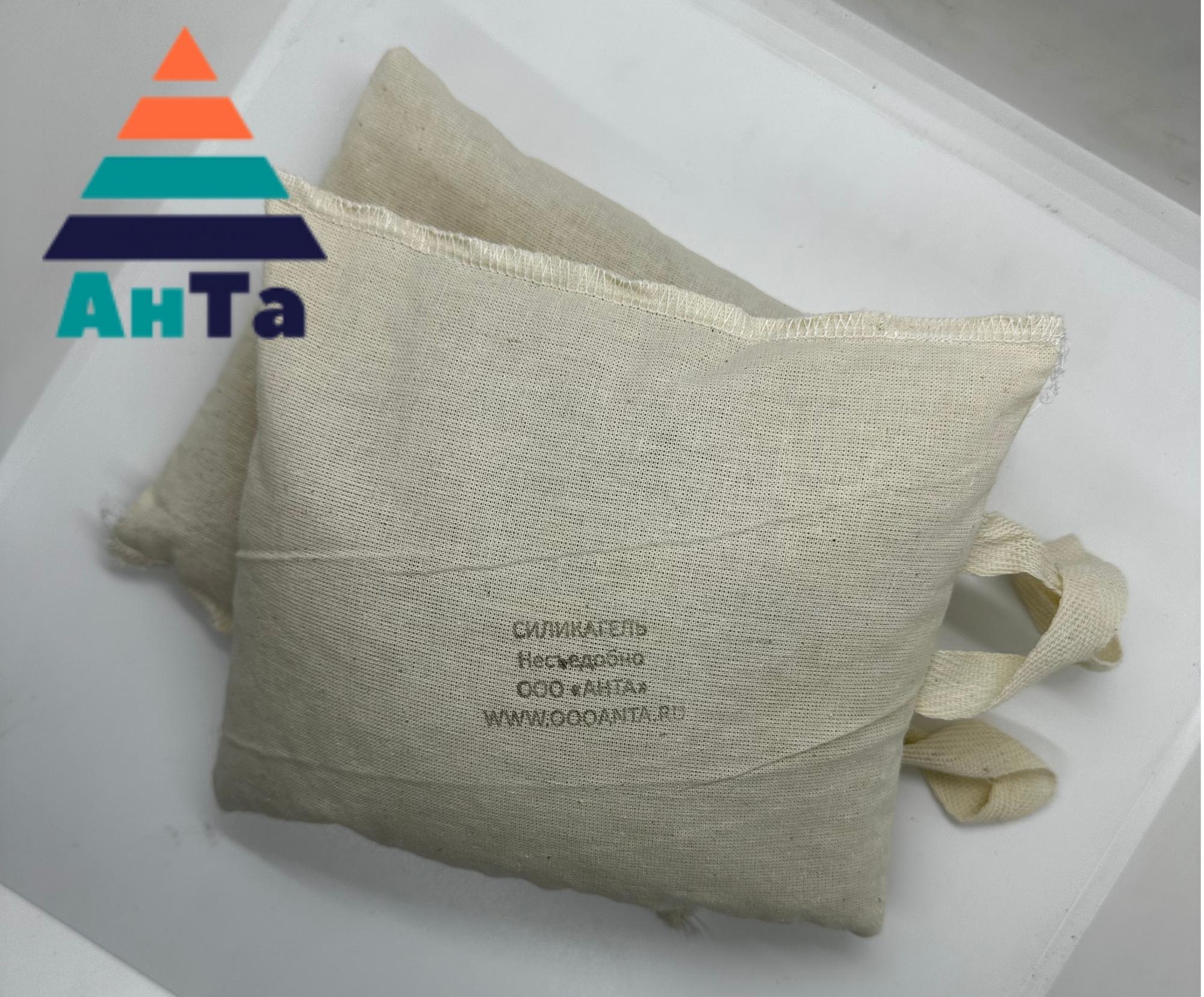 Силикагель марки КСМГ по ГОСТу 3956–76, фасованный в специальный тканевый мешочек по ТУ 20.13.24-001-20298088-2018. Прочность хлопковой ткани позволяет использовать многократно продукт.