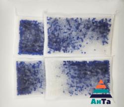 Силикагель индикаторный фасованный в пакетики из нетканного полотна от 10 гр до 1 кг. Синие гранулы силикагеля покрытые слоями кобальта по мере впитывания влаги и понижения активности меняют окраску с ярко-синего на розовый. Подвергаются регенерации в течение нескольких часов при температуре 120-130°С с полным восстановлением свойств и первоначальной окраски.