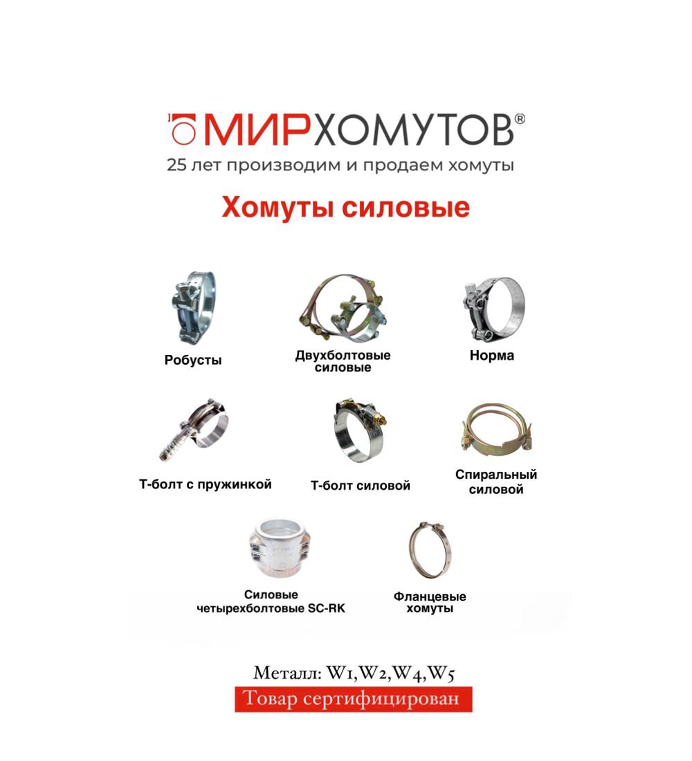 Обращаем Ваше внимание на хомут стальной ROBUST: в настоящее время силовые хомуты этой марки выигрывают по показателям прочности у аналогичных хомутов других производителей. Также заслуживают повышенного доверия и остальные хомуты силовые (спиральные, пружинные, двухболтовые), предлагаемые компанией «Мир Хомутов».
