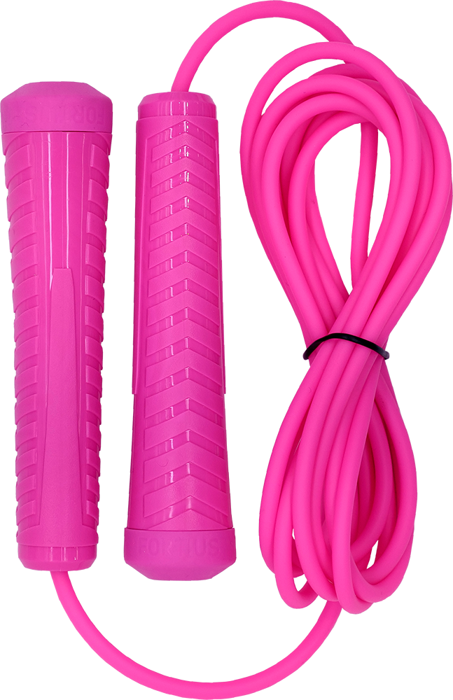 Шнур: ПВХ. Диаметр шнура: 5 мм. Длина шнура: 3 м. Цвет шнура: розовый. Есть возможность регулировки длины. Материал изготовления ручки: полипропилен. Цвет ручек: розовый. На ручках крышки в цвет ручки. Материал изготовления крышек: ТЭП. Упаковка: пакет с европодвесом.