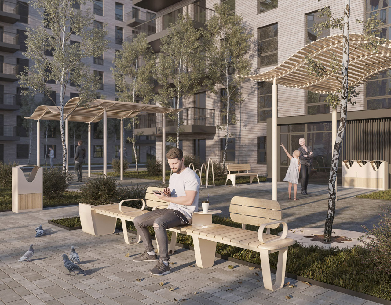 Чтобы жителям комфортно было находиться во дворе не только в хорошую погоду, мы учли и создали волнообразную перголу, защищающую от солнца и несильного дождя, скамейки с usb-зарядными устройствами и удобными подставками под кофе и другие вещи, столики, за которыми будем удобно перекусить или почитать, приствольные решетки для деревьев, чтобы во дворе было чище, шезлонги для солнечных дней, качели, велопарковки, урны для сортировки мусора, ограничители движения для машин, информационные указатели и ограждения для мусорных баков.