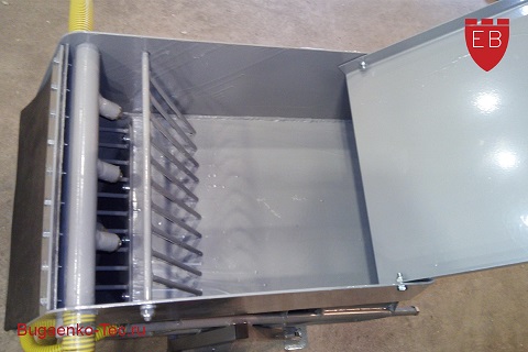 Приемный бункер: поворотная система размыва со съемными наконечниками, предварительный откидной грохот, основной съемный грохот, водяной коллектор, экраны для интенсивного размыва.