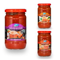 Состав: Вода, томатная паста, сахар, загуститель Е1422, соль, специи и пряности, уксус, консервант: бензоат натрия, пищевой краситель Е122.