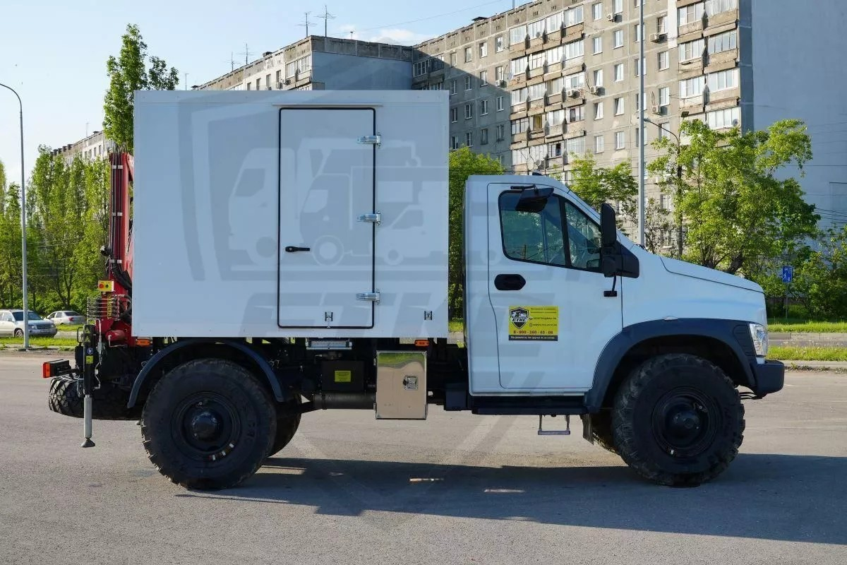 Передвижная мастерская на базу ГАЗ Садко Некст с фургоном, краном манипулятором и синхронным генератором, оборудованным для проведения ремонтных и восстановительных работ в автономных полевых условиях. Оснащение фургона мастерской производится по индивидуальному заказу, с учетом производимых работ, например установлены бочки для масел с раздаточной катушкой, насосом, пистолетом и фильтром. также установлен пресс, верстак -тумба, заточной, сверлильный станки, пуско-зарядное устройство и компрессор.