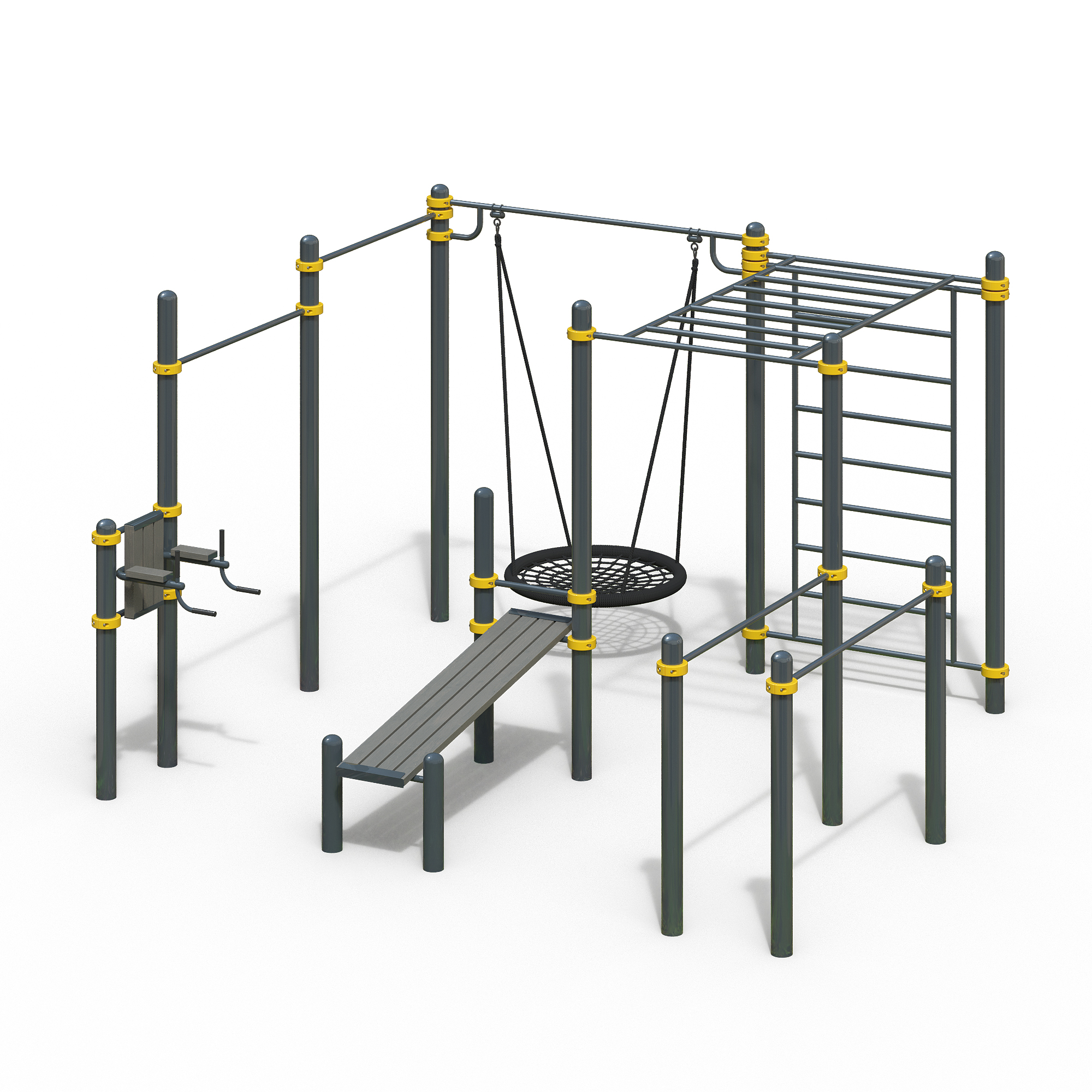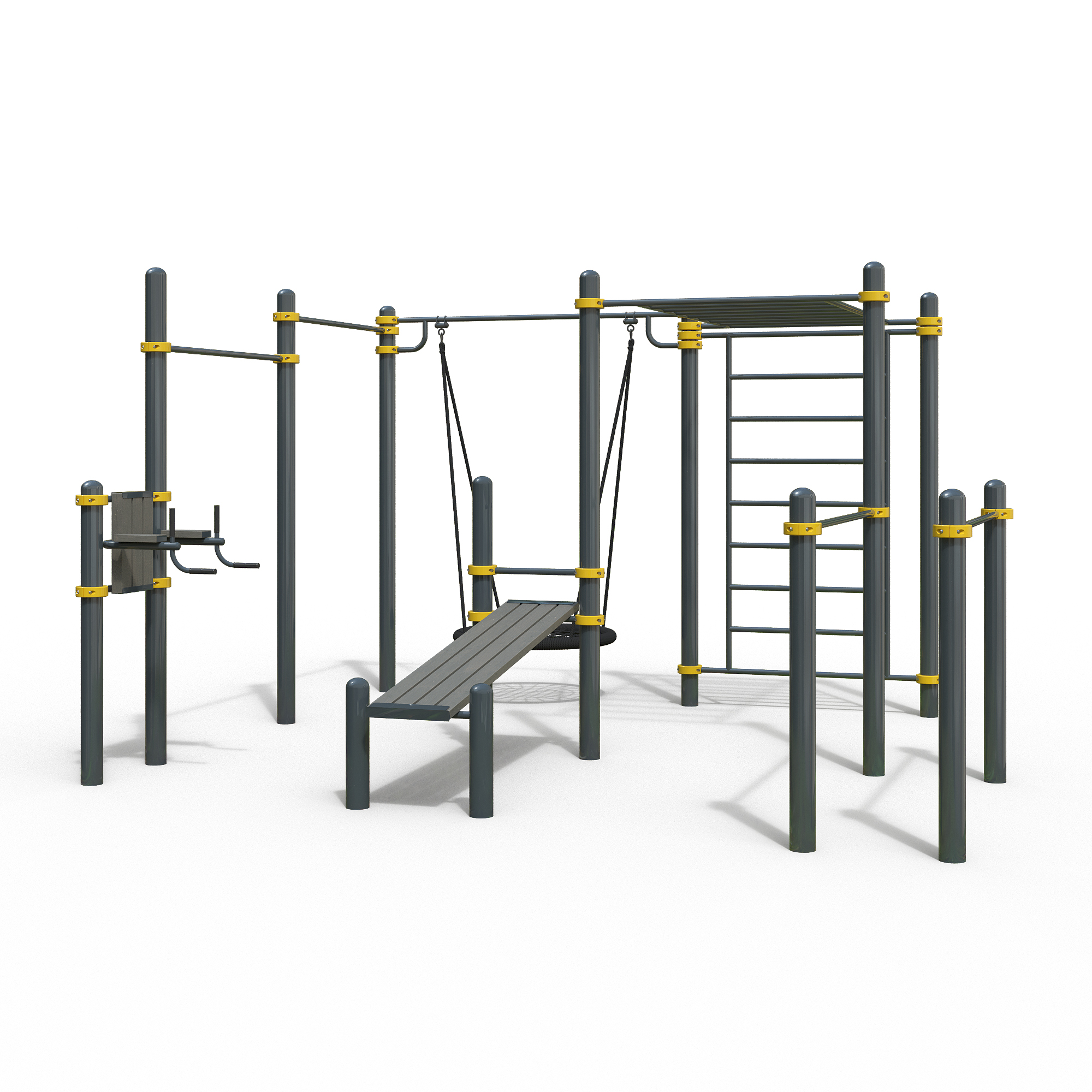 Уличный спортивный комплекс для workout WK-66 устанавливается в общественных пространствах и на частных участках. Диаметр стоек 108 мм. Хомуты выполнены из стали. Лавка для пресса и брусья-пресс выполнена из бруса ДПК. Покраска с грунтовкой в 3 этапа.