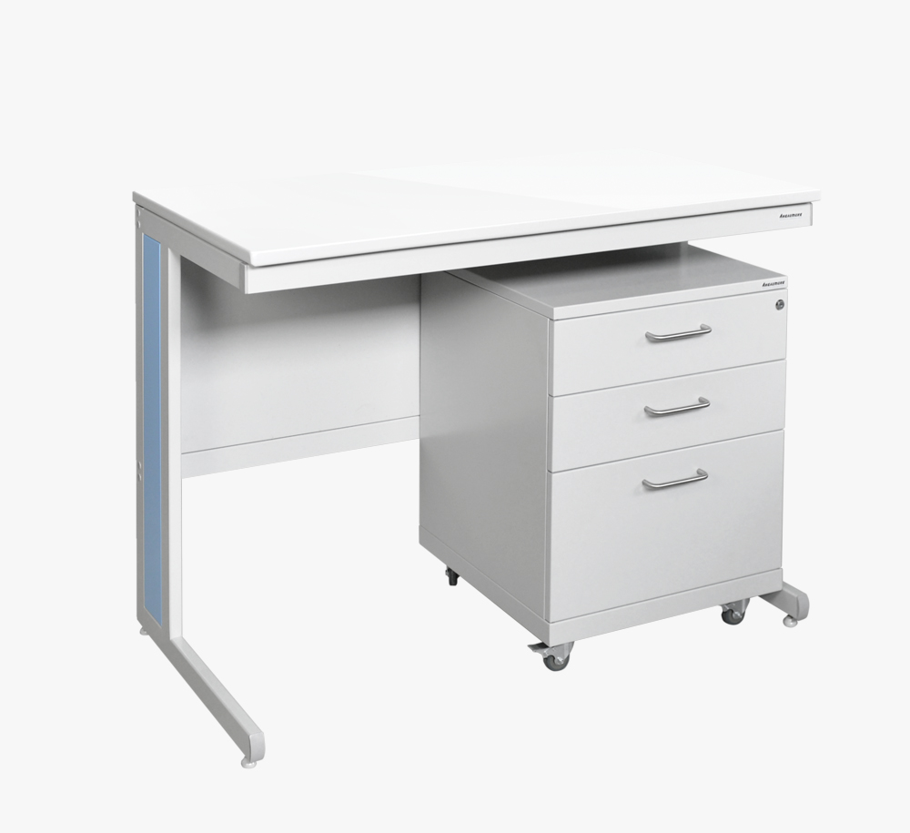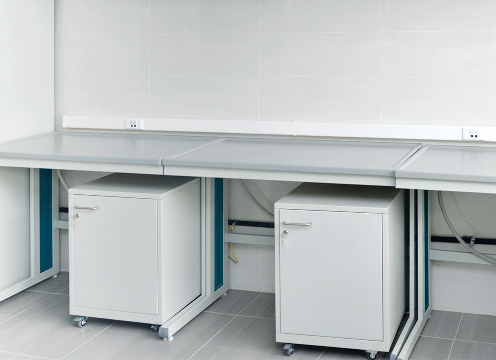 Базовый элемент любой лаборатории, подходит как для машинописных работ, так и для проведения анализов. Прочный С-образный каркас из профиля 50 х 25 х 1,5 мм позволяет выдерживать нагрузки до 250 кг в стандартном исполнении. Столы окрашиваются в светло-серый цвет RAL 7035. Светло-голубые вставки в сочетании с темно-серыми заглушками декорируют и дополняют конструкцию.