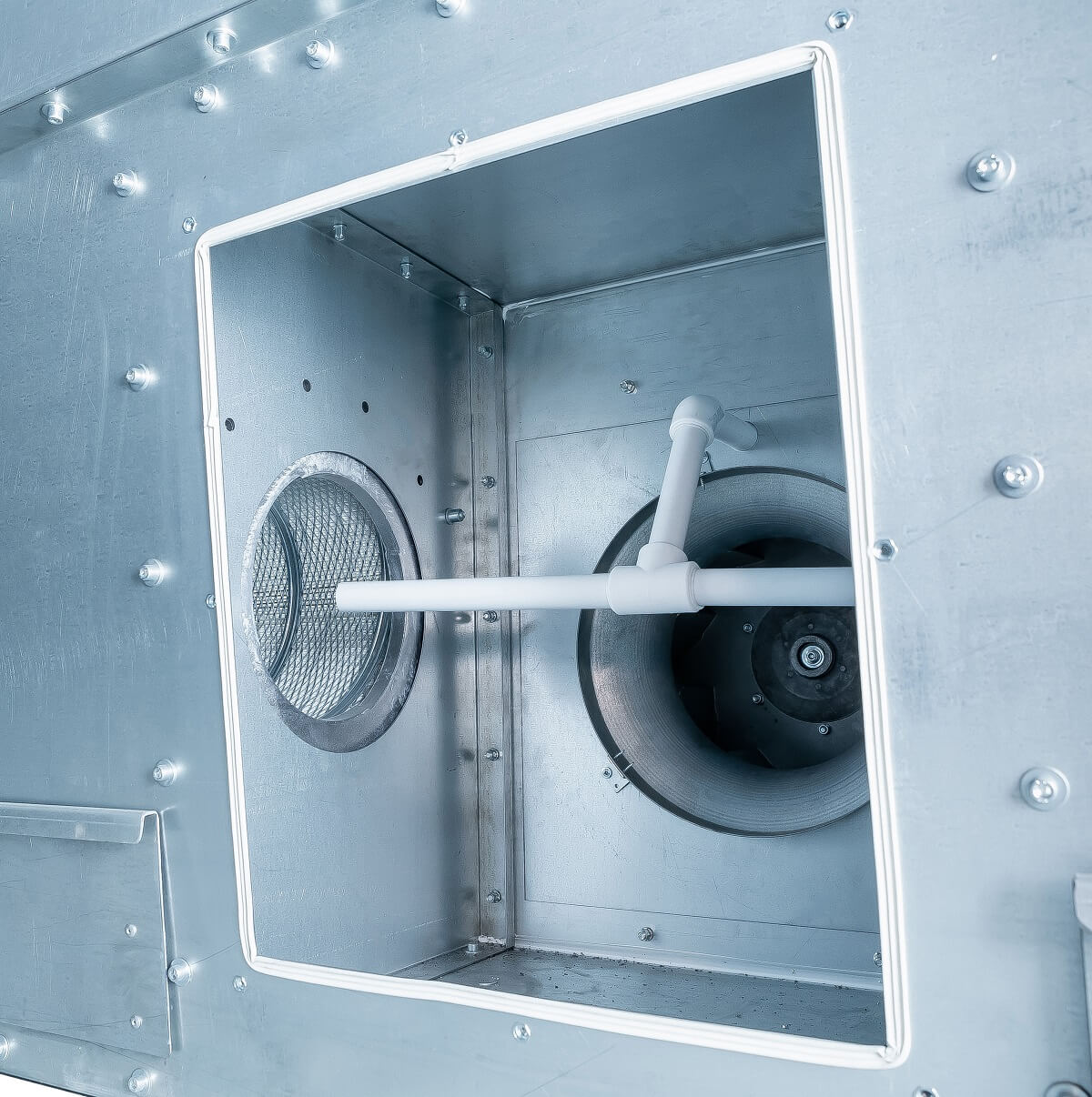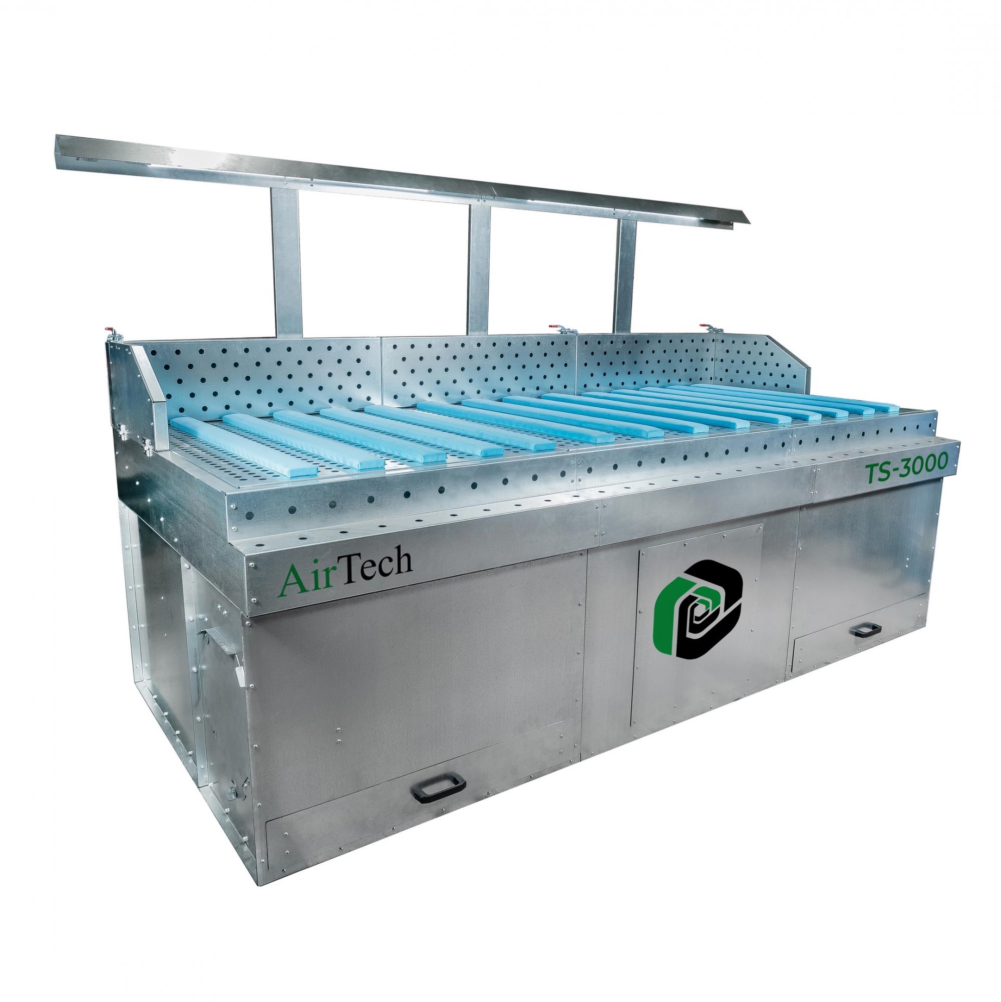 Принцип работы: вентилятор, установленный в чистой зоне, создает разрежение внутри. Воздушный поток, направленный в стол подхватывает пыль, образующуюся при обработке материала. Загрязненный воздух проходит через фильтровальные картриджные элементы, которые задерживают частицы пыли из воздуха. Очищенный воздух вновь поступает в рабочее помещение.