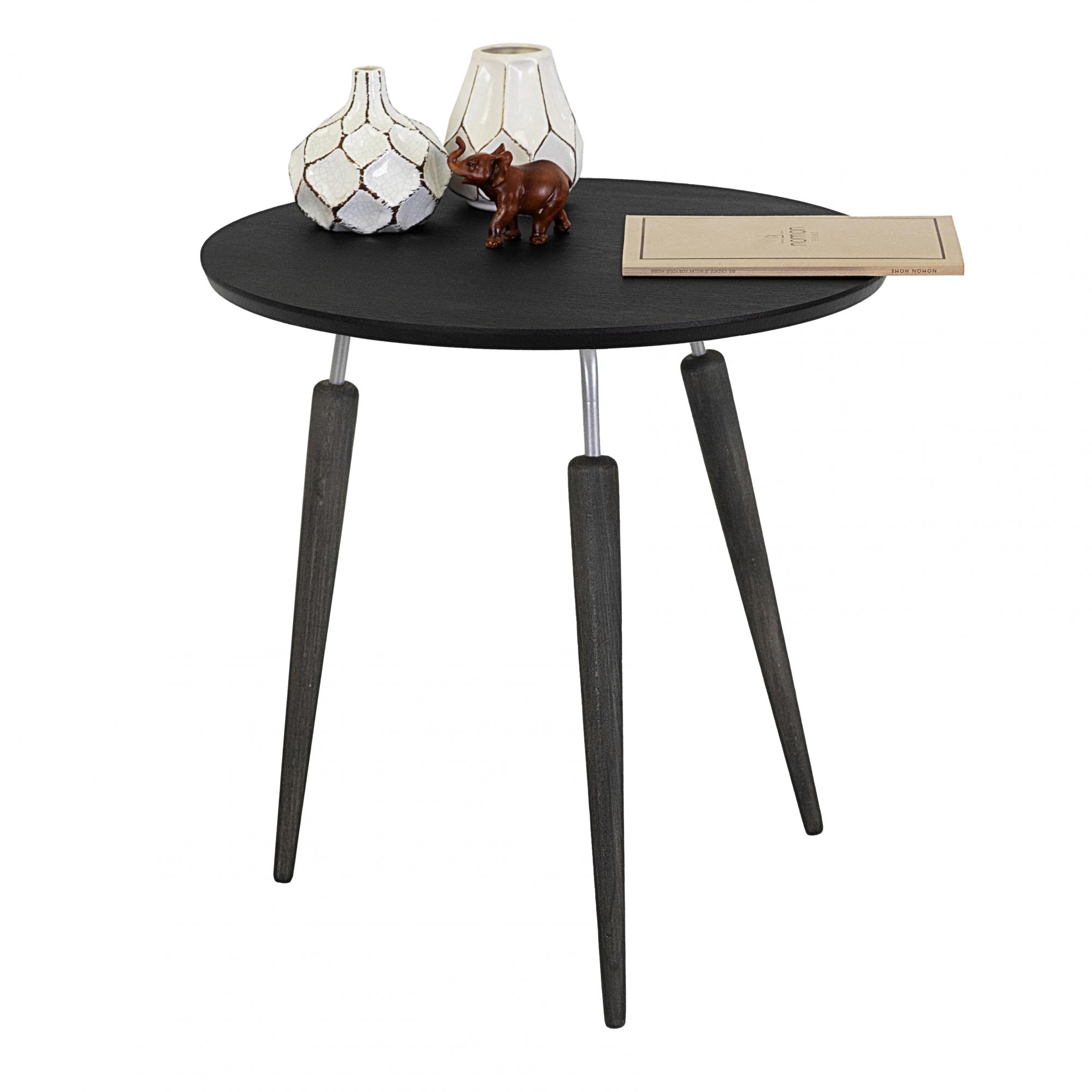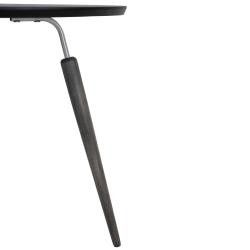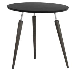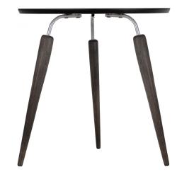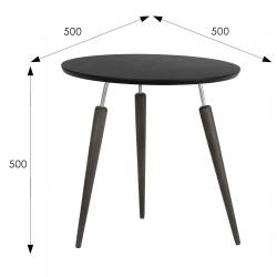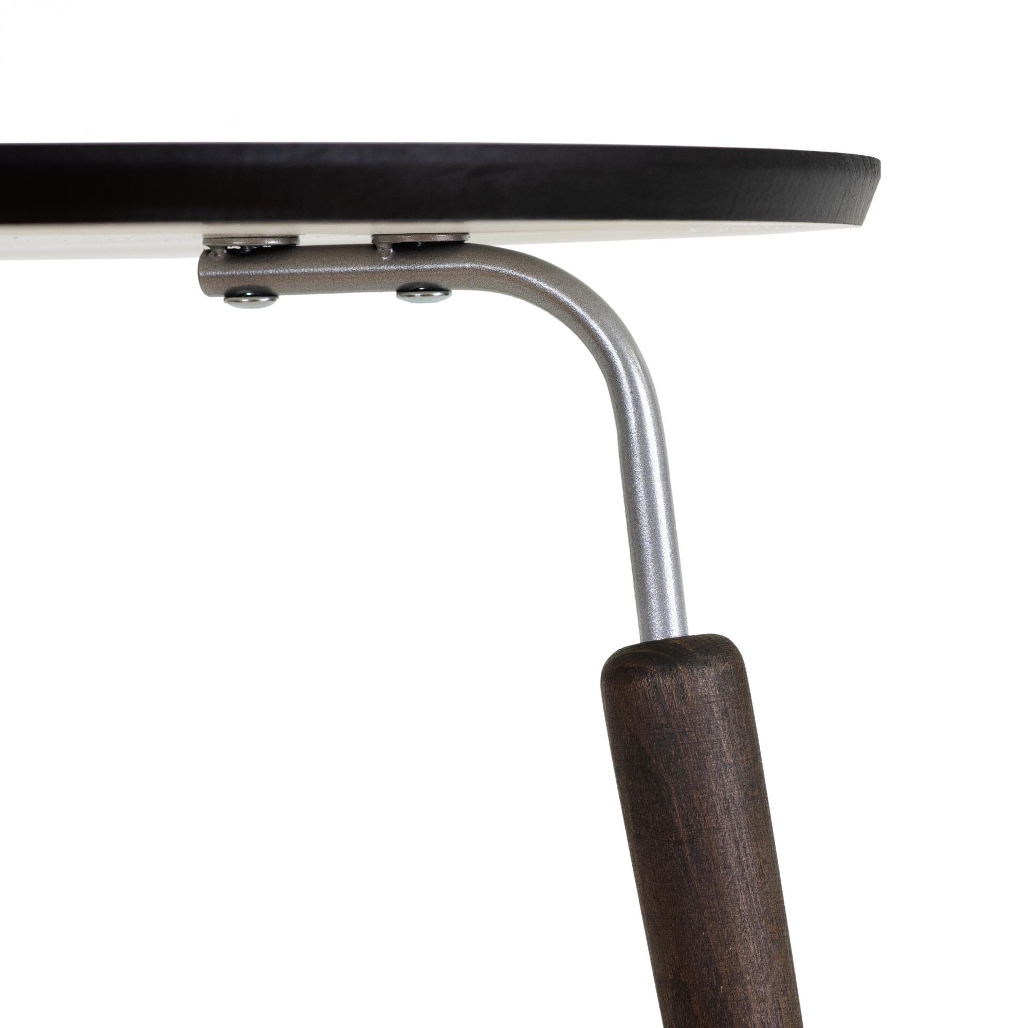 Предмет мебели сочетает в себе деревянные и металлические элементы. Круглая столешница изготовлена из МДФ покрыта защитной плёнкой. Кромка настольной полки аккуратно сглажена. Ножки стола по форме напоминают морковки. Они изготовлены из натурального дерева, массива бука. Предложенные для модели цветовые решения смотрятся очень благородно.