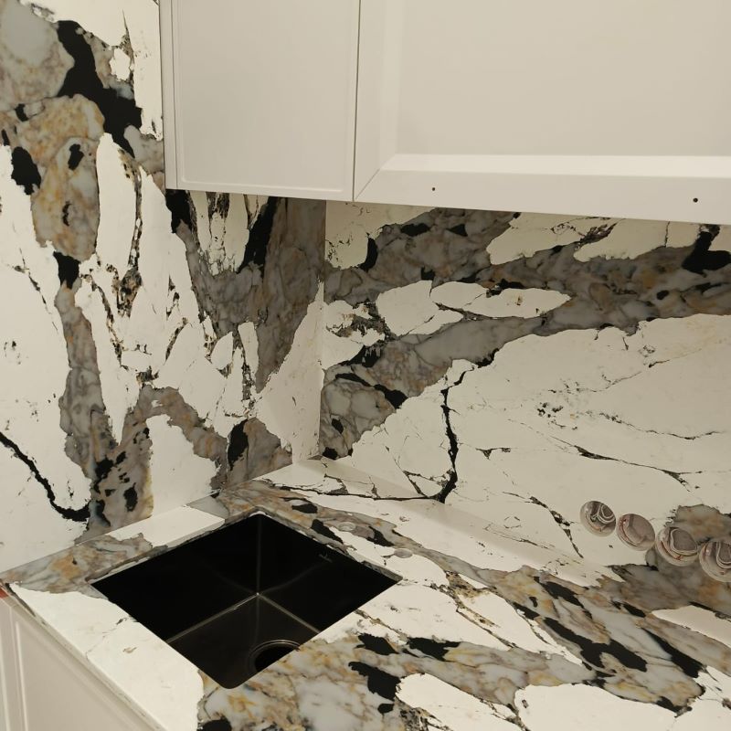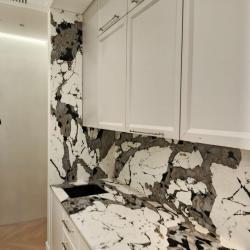 Изготовлена столешница и стеновая панель из кварцевого агломерата Noble Quartz Q901. Мойка с подклейкой снизу.