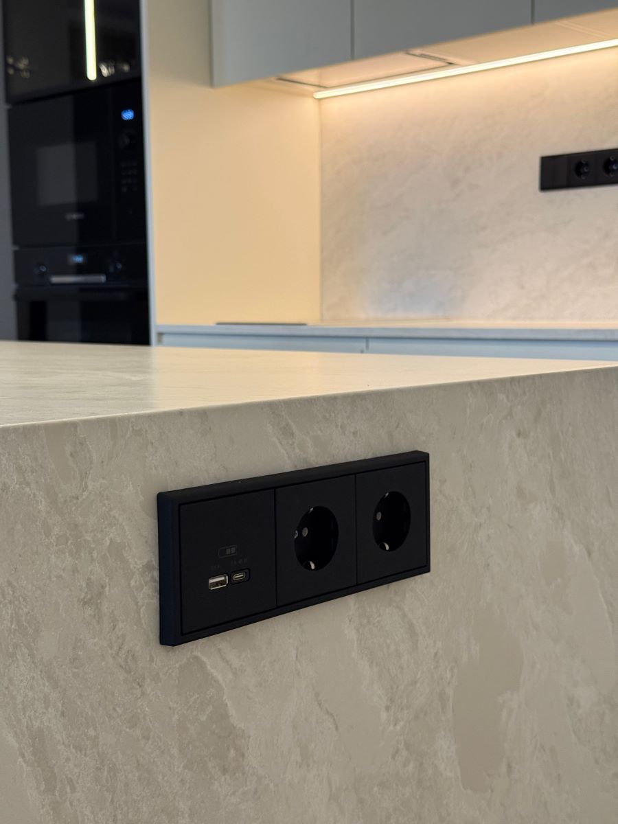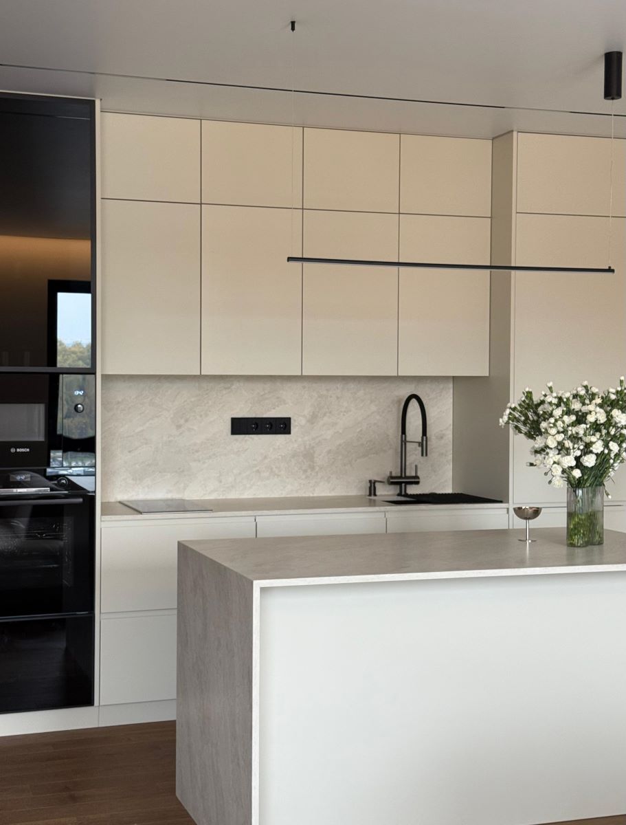 Выполнены столешница, стеновая панель, а также остров с 2-мя опорами из искусственного камня бренда Vicоstone (серия BQ, цвет 8891 Madreperola).