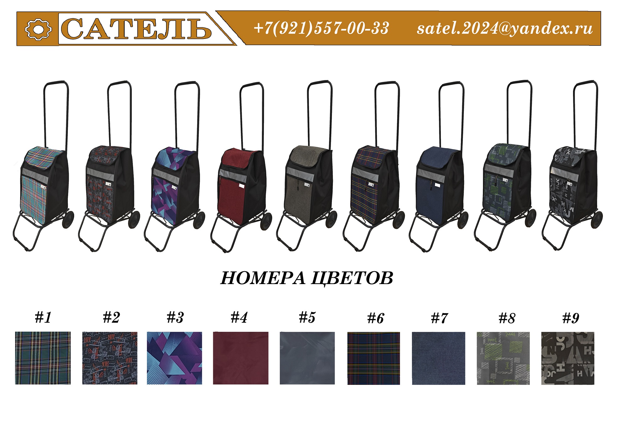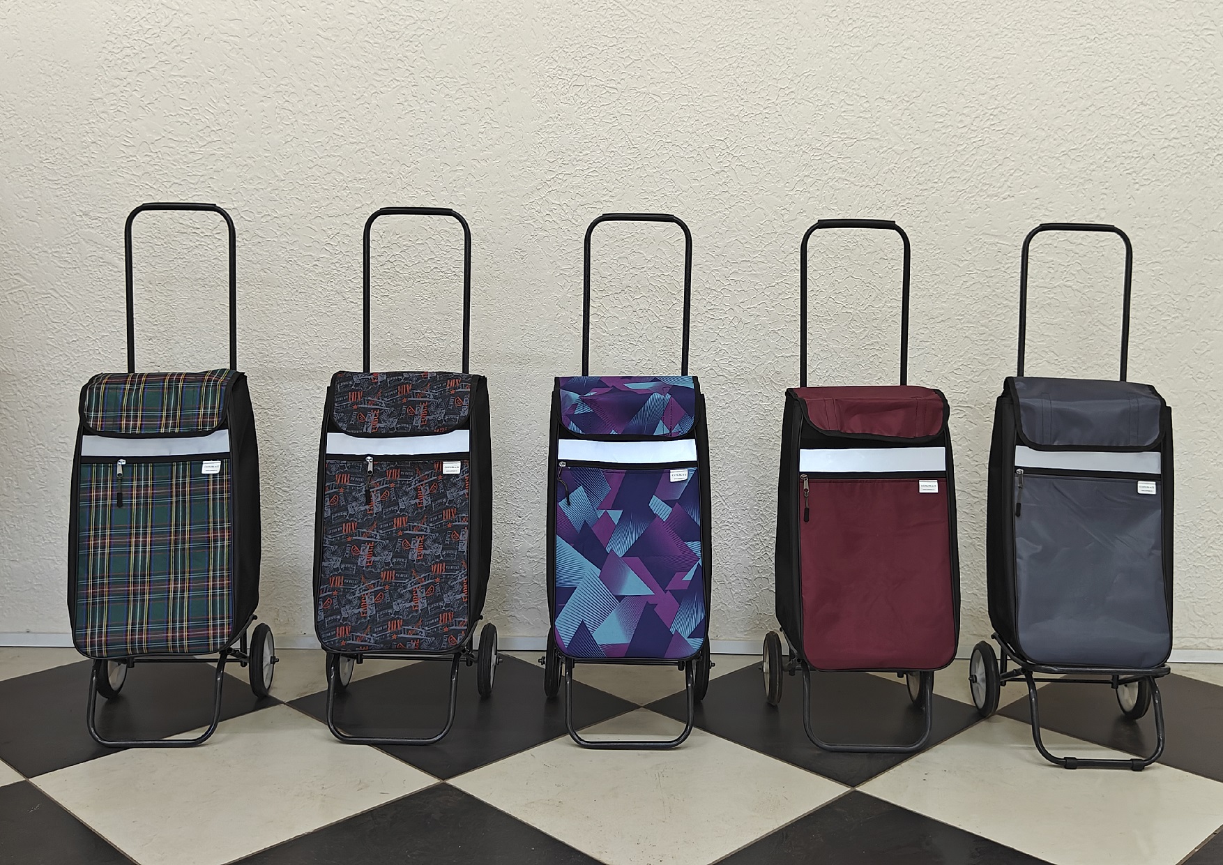 Сумка-тележка, укомплектованная сумкой по габаритам тележки. Надежная, проверенная конструкция. Доступны варианты в двух размерах и в пяти расцветках.