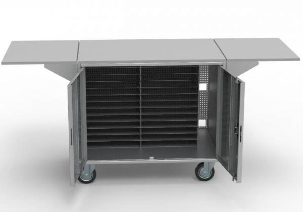 Интернет-магазин предлагает купить мобильную тележку для хранения и подзарядки ноутбуков. Это незаменимый атрибут для компьютерных классов, студенческих аудиторий и других учебных заведений. Модель НБ-26 предназначена для планшетов и ноутбуков - для этого есть двадцать шесть горизонтальных отсеков плюс отделение для элементов питания. Столешница - раскладная, она легко трансформируется в рабочее место для преподавателя, где можно разместить принтер, сканер и другую оргтехнику. Предусмотрена возможность централизованного подключения к сети путем оснащения тележки сетевыми фильтрами с УЗО. Задняя стенка перфорированная. Наша компания напрямую работает с производителями металлической мебели для учебных заведений, поэтому цена тележки хранилища ноутбуков – всегда доступная.
