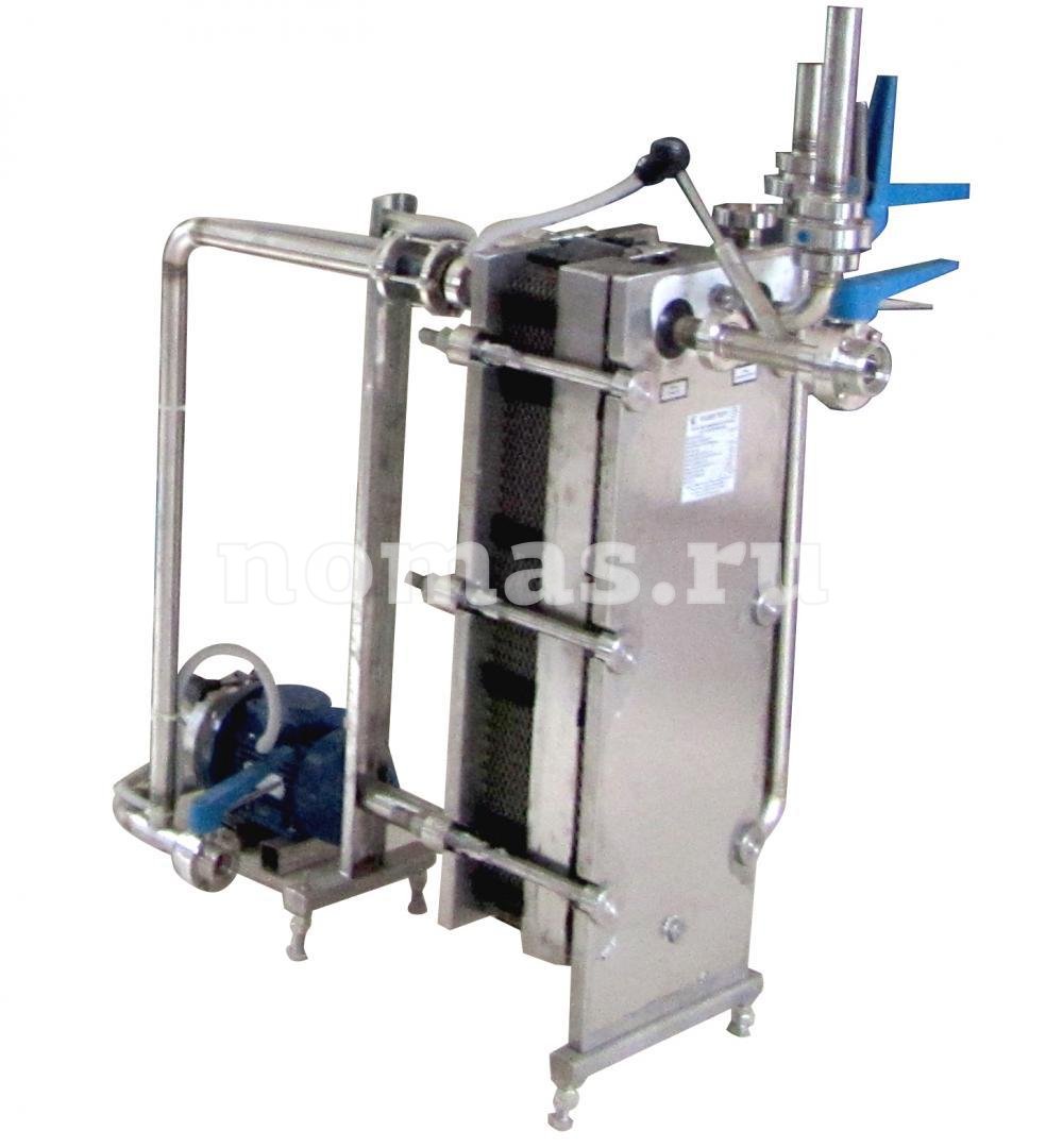 Теплообменник контурный — разборный пластинчатый охладитель‑утилизатор для быстрого охлаждения осветленного сусла в тонкослойном потоке с одновременной рекуперацией тепла в горячую воду. Два независимых контура: вода +5…+12 °C для первичного охлаждения и накопления горячей воды до 80 °C, затем пропиленгликоль −4 °C для доведения сусла до температуры внесения дрожжей. Производительность — до 10 000 л/ч.