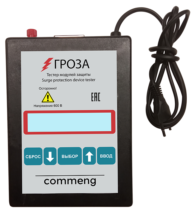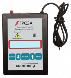 Тестер модулей защиты «Гроза» предназначен для автоматизированной проверки исправности и измерения параметров устройств защиты от перенапряжений (УЗИП) различных типов. Статическое напряжение пробоя разрядников, классификационное напряжение варисторов и полупроводниковых элементов измеряется в пределах до 550 Вольт. Интерфейс с компьютером позволяет выполнять серию измерений с заданным набором параметров, обработку и архивацию результатов. Для подключения устройств различных типов используются управляемые адаптеры или измерительные шнуры.