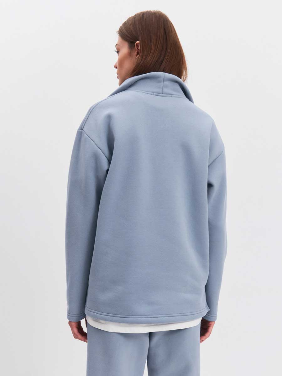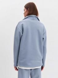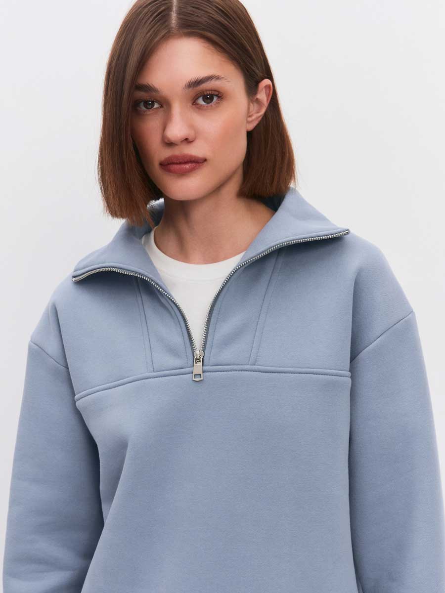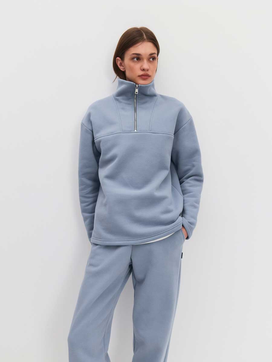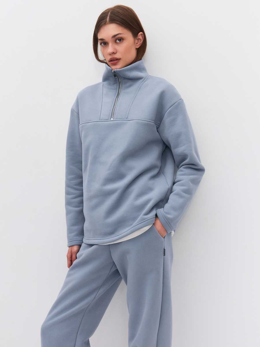 Женская толстовка из футера 3-х нитка микро-начес с "эффектом велюра". Толстовка с втачным рукавом и втачным модельным воротником. Центральная застежка на короткую металлическую молнию. Низ толстовки, низ рукавов обработаны на плоскошовной м-не. По боковым швам – разрезы.