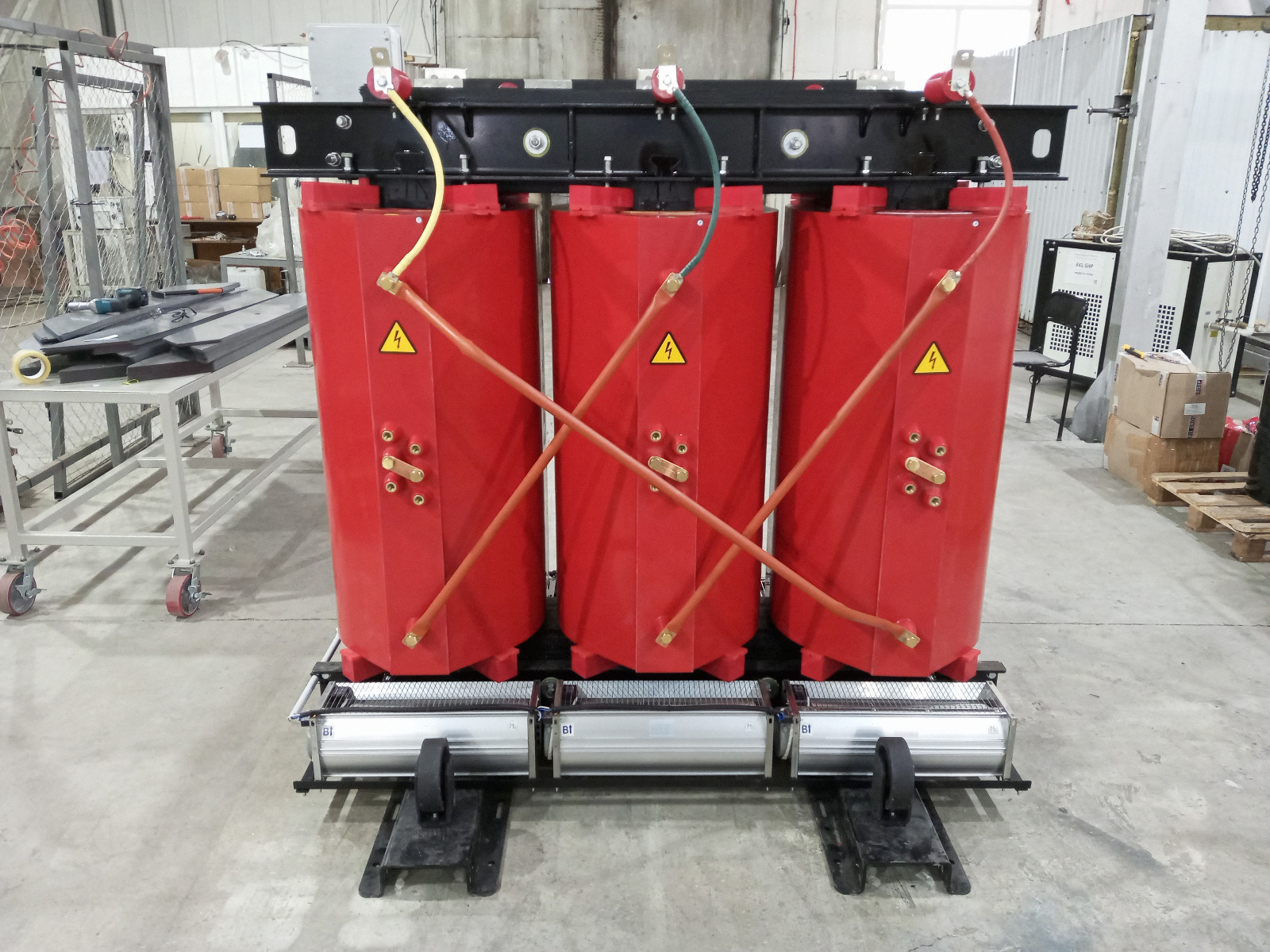 Производитель сухих трансформаторов ЭТК «Электронмаш» предлагает трансформаторы типа ТСЛ и ТСЗЛ. Трансформатор сухой ТСЛ с литой изоляцией. Купить силовой сухой трансформатор вы можете у производителя. Трехфазные сухие трансформаторы имеются в наличии и на заказ. Трансформатор сухой с литой изоляцией может быть укомплектован принудительной вентиляцией. Характеристики сухого трансформатора Силовые трансформаторы сухого типа с литой изоляцией ТСЛ имеют стандартизированные технические и эксплуатационные параметры в соответствии с ГОСТ Р 52719 – 2007 (МЭК/IEC). Данный тип трансформатора выпускается в защитном корпусе (кожухе). Аббревиатура ТСЛ трансформатора расшифровывается как: - Трансформатор трехфазный, - Трансформатор сухой, - Трансформатор с литой изоляцией, изготовленной по технологии вакуумного литья. Уникальность технологий сухого трансформатора и преимущества сухих трансформаторов: Пожаробезопасность – пожалуй первое преимущество сухих трансформаторов. Намотка трансформатора изолируется эпоксидной смолой, кварцевым порошком и другими наполнителями. Тип изоляции относится к классу F(155ºC). Сердечник трансформатора (магнитопровод) изготавливается из специальной тонколистовой трансформаторной стали. Магнитопроводы собственного производства изготавливаются из аморфной стали. Этот тип магнитопровода в настоящее время имеет самые низкие в мире потери холостого хода p0. Использование аморфных сплавов также означает, что потери в аморфных трансформаторах в среднем в четыре раза ниже, чем в стандартных трансформаторах с сердечником из холоднокатаной стали. Поэтому затраты на электроэнергию также в четыре раза ниже, когда трансформатор находится под напряжением, даже при отсутствии нагрузки. К дополнительным преимуществам снижения "потерь железа" относятся уменьшение шума, издаваемого трансформатором, и снижение температуры нагрева трансформатора. К преимуществам сухих трансформаторов перед масляными можно отнести низкую «стоимость владения». Иными словами, низкие затраты в период его эксплуатации. Не требуется оплата лабораторных испытаний трансформаторного масла. Нет необходимости затрат на покупку трансформаторного масла и его замену. А во избежание «человеческого фактора» масляные трансформаторы требуют четкого соблюдения регламентных работ, связанных с обслуживанием трансформатора. Поэтому с точки зрения экономической целесообразности, сухие трансформаторы имеют преимущества. В результате, в процессе эксплуатации, высокая стоимость сухого трансформатора окупает себя. Область применения сухих трансформаторов и общие характеристики. Трехфазные сухие трансформаторы из литой смолы используются для понижения напряжения в энергосистемах, системах электроснабжения потребителей и промышленных подстанциях. Данная модель используется в качестве понижающего трансформатора тока. Может применятся для сборки КТП а так же в качестве трансформатора подстанции где требуется высокий уровень пожарной безопасности. Сухой трехфазный трансформатор тсл с литой изоляцией предназначен для эксплуатации как внутри цеха. ГОСТ 15150-69 на сухие трансформаторы регламентирует исполнение для различных климатических районов. Степень защиты трансформатора IP00 - относит его к трансформатору для эксплуатации 