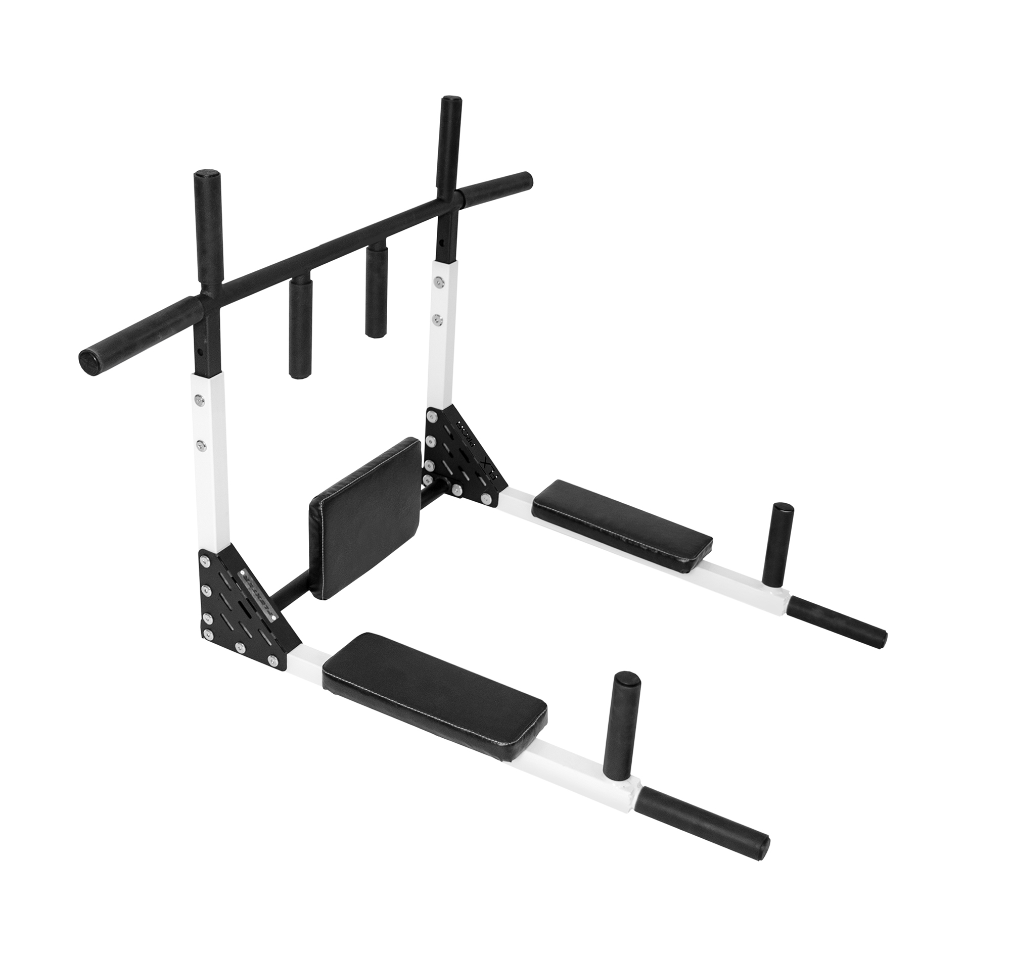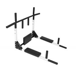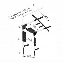 Имеет два положения: "Турник" и "Брусья-пресс". Вешается на стену на две мощные петли из стали 4 мм. Снятие тренажера с петель и смена положения занимает не более 5 секунд. Турник имеет регулируемый вынос (расстояние от стены) 559 мм и 615 мм и 4 удобных хвата.