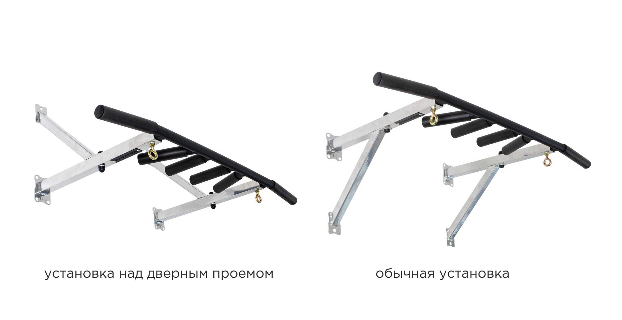 Турник можно расположить прямо над дверным проёмом, установив укосины сверху, над креплениями турника.