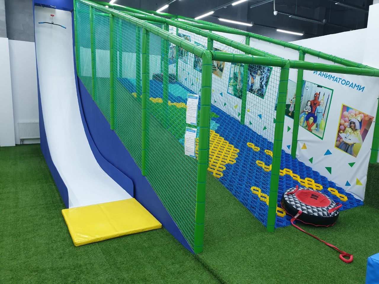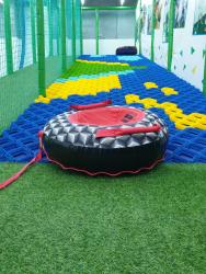 Горка с специальным покрытием, которое имитирует скольжение снега. Спуск осуществляется при помощи ватрушки. Весело и безопасно.