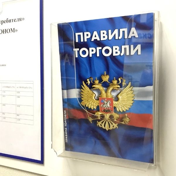 В комплекте: крепеж, 3 брошюры с с нормативно-правовыми актами: О защите прав потребителей, Книга отзывов и предложений, Правила торговли.