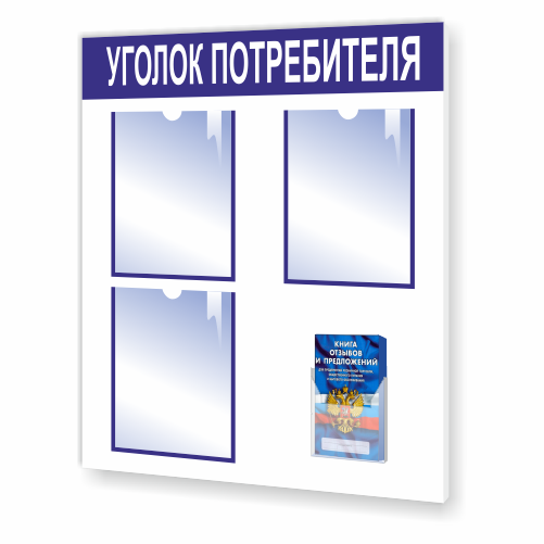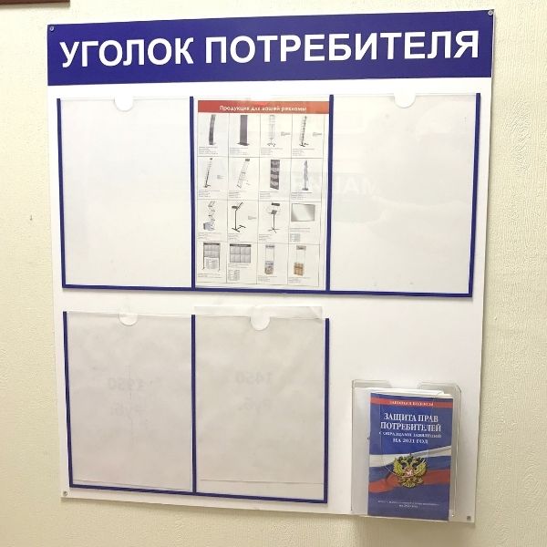 Уголок потребителя эконом с книжками – это доска со специальными карманами для размещения в них листов A4. Стенд с размещенной на нем информацией показывает ваше внимание к посетителям и формирует таким образом положительную репутацию компании. Он устанавливается перед входом на предприятие, а также в местах массового скопления людей. Уголок потребителя эконом с книжками уместно использовать в магазинах, аптеках, банках, салонах красоты и других предприятиях. Сервисные и торговые предприятия размещают в «Уголке» потребителя следующую информацию: книгу отзывов, план эвакуации, копию лицензии и т. д.