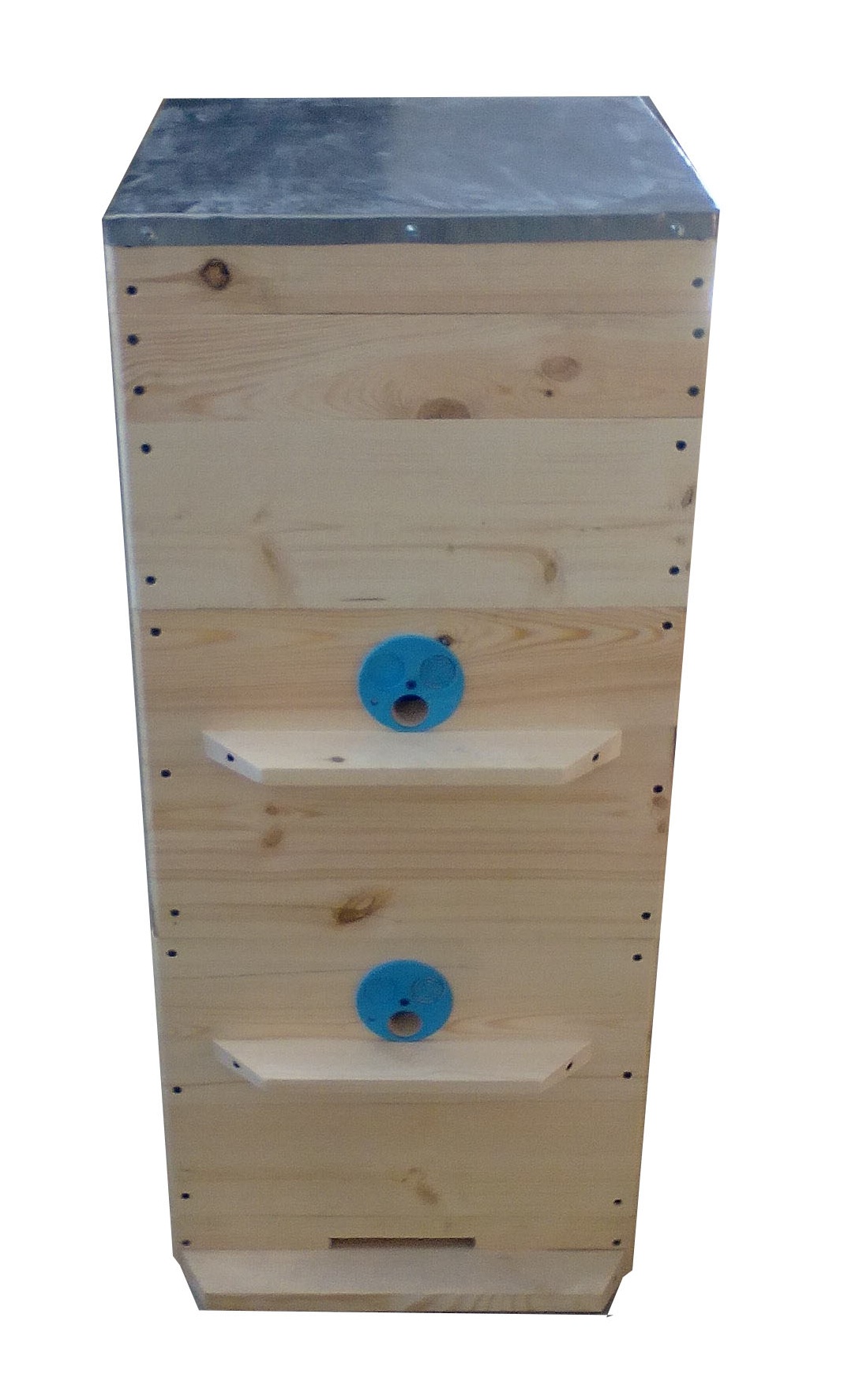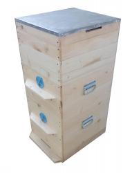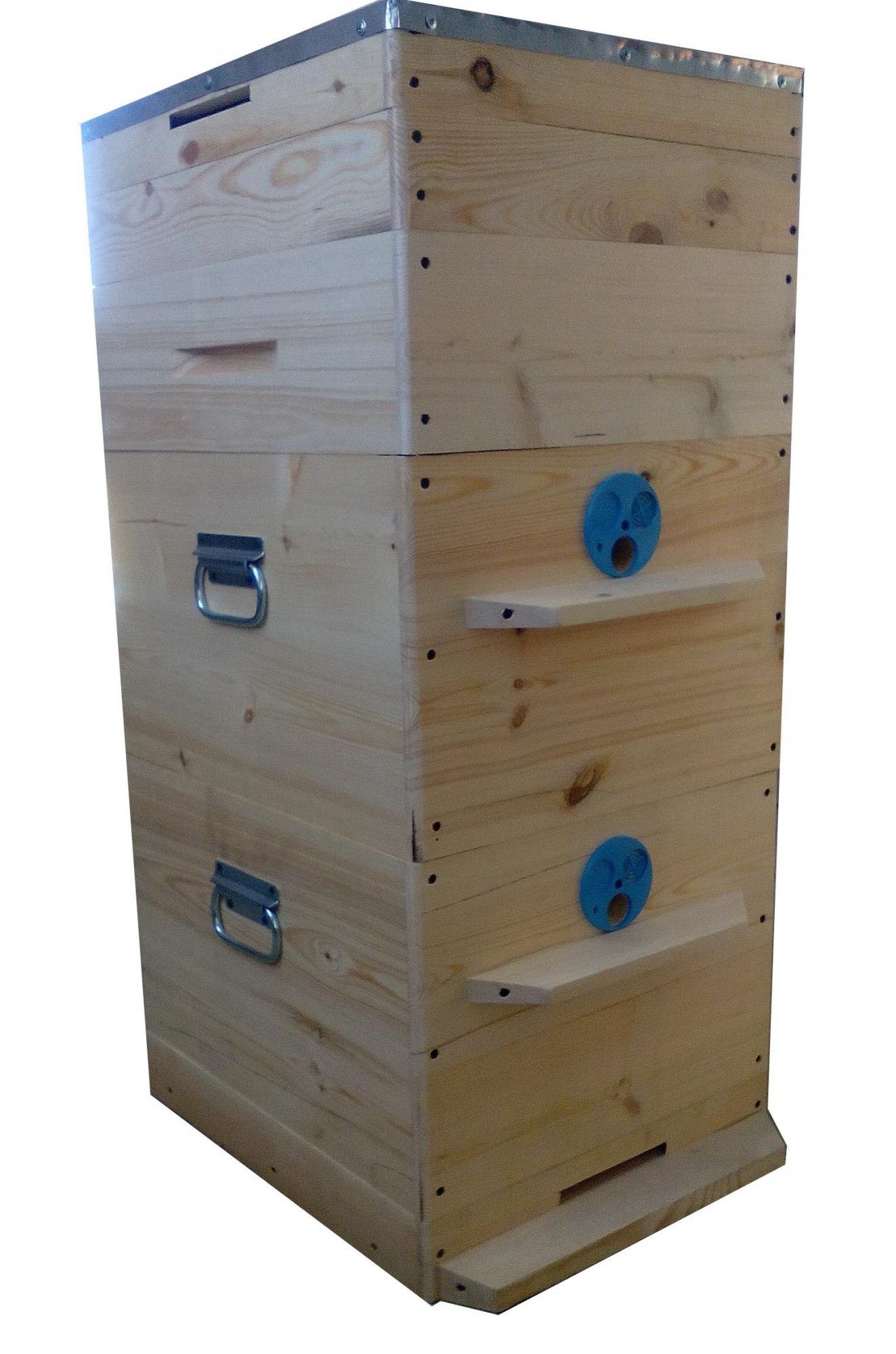 В комплект входят: крыша, подкрышник, корпус, дно. Можно добавлять корпуса, магазины, рамки. Дно съемное, на крыше оцинкованная сталь.