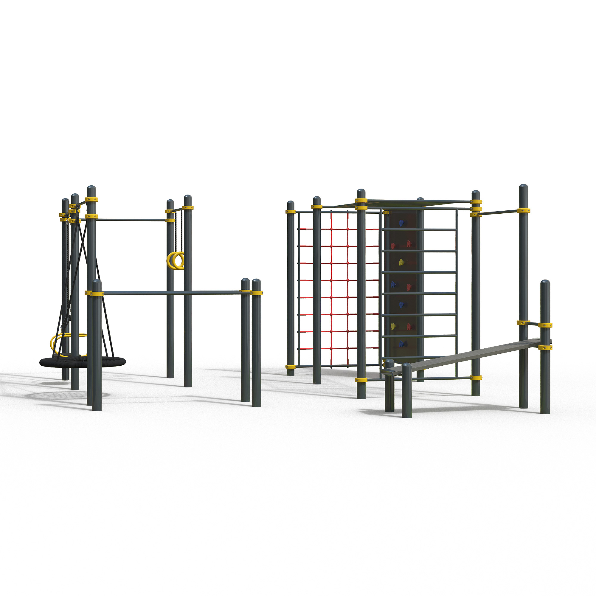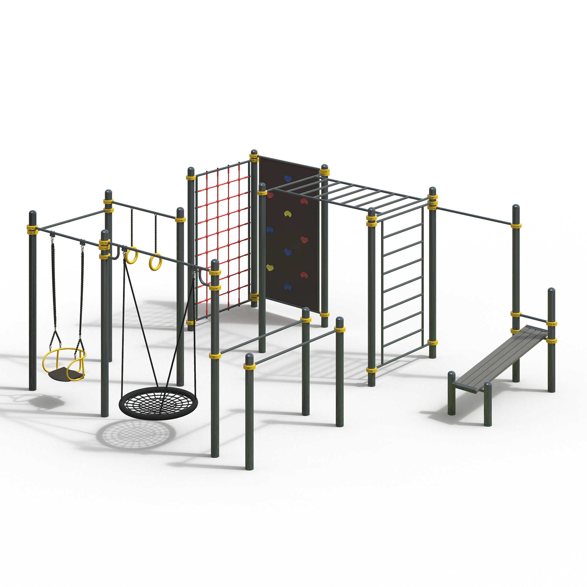 Уличный спортивный комплекс для workout WK-89 устанавливается в общественных пространствах и на частных участках. Диаметр стоек 108 мм. Хомуты выполнены из стали. Лавка для пресса и брусья-пресс выполнена из бруса ДПК. Покраска с грунтовкой в 3 этапа.