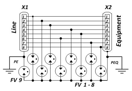 Между каждым проводом и точкой уравнивания потенциалов включены газонаполненные разрядники FV1- FV8 (см. рис. 2). Точка уравнивания потенциалов соединена с клеммой защитного заземления PE через разрядник FV9, с клеммой защитного уравнивания PEQ напрямую. PE и PEQ соединены с металлическим экранами разъёмов «Line» (линия) и «Equipment» (оборудование).