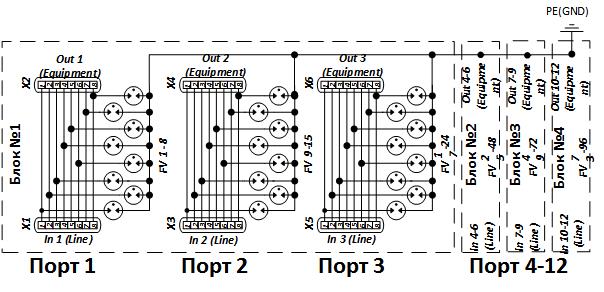 Схема защиты, в панели Commeng 12-Cat5P-19″ f/f, состоит из двенадцати одинаковых частей (см. рис. 2), разделённых на 4 блока. Каждый блок обеспечивает защиту и подключение трёх портов оборудования Ethernet. Все двенадцать частей (портов) имеют общую точку уравнивания потенциалов PE(GND). Работа схемы основана на принципе уравнивания потенциалов и выполнена на базе газонаполненных разрядников.