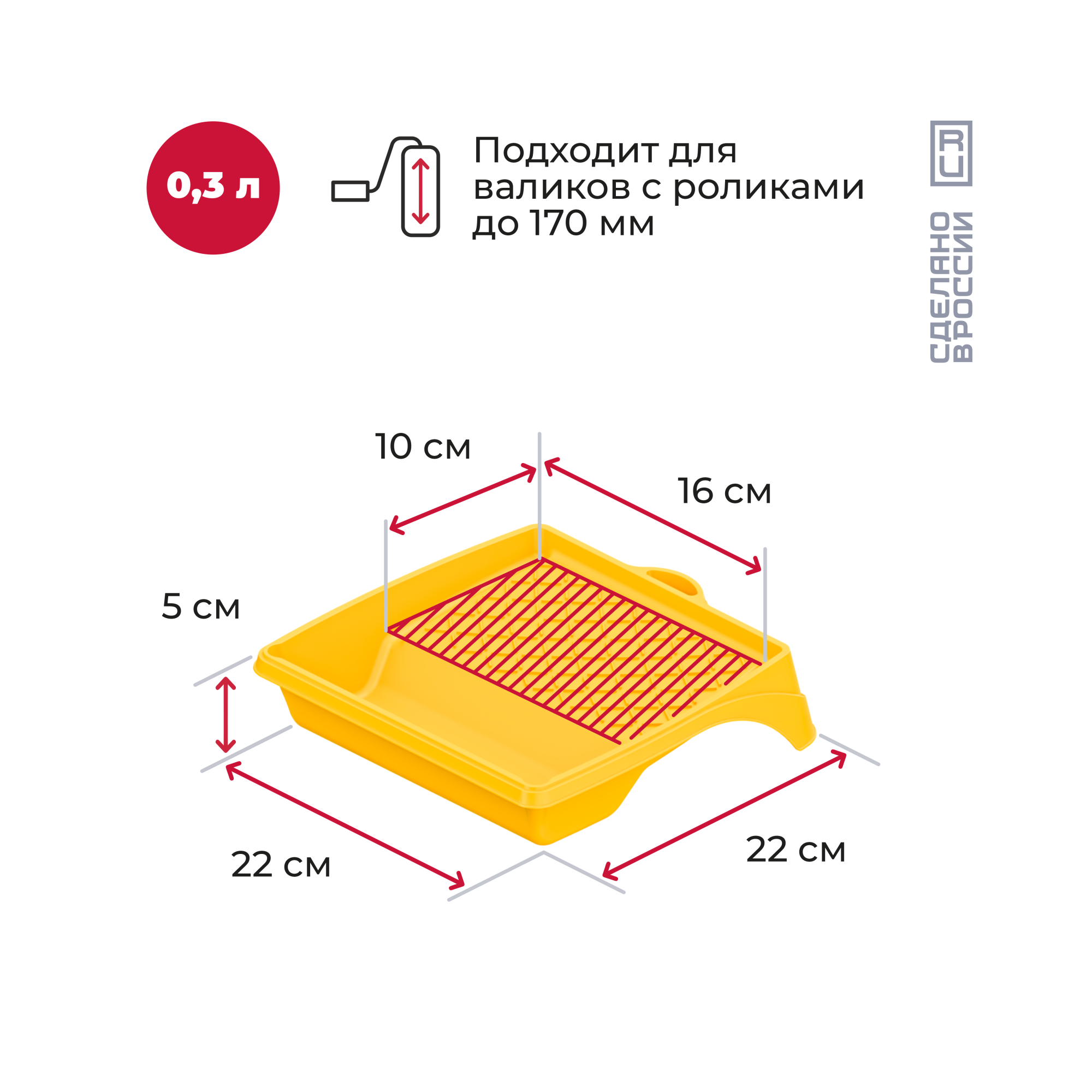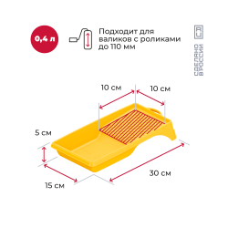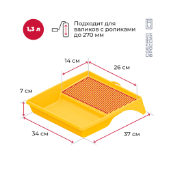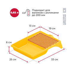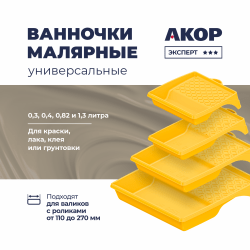 Ванночки объемом 300 мл, 400 мл, 820 мл и 1300 мл. Подходят для краски, лака, клея или грунтовки. Имеют прокатную поверхность, уголок для слива и мерную риску. Легко переносят транспортировку.